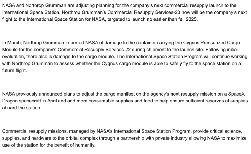 当然了,短期内修好肯定是不行了,所以NASA决定跳过此次任务,下一次直接执行NG-23任务,而该任务计划于今年秋季执行。