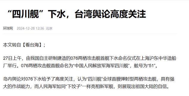 信息来源:环球网2024-12-28“四川舰”下水,台湾舆论高度关注