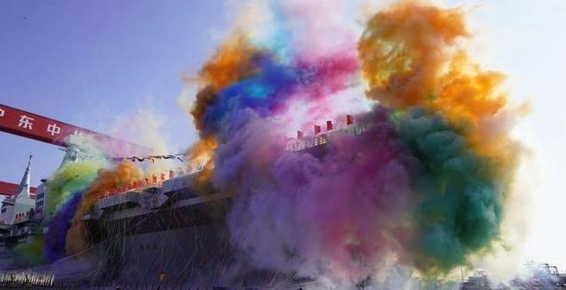 在四川舰下水的当天场面十分热闹,舰首彩球打开,舰舷喷射出绚丽的彩带,当船坞开始注水时,也就代表仪式正式开始,排面十分壮观。