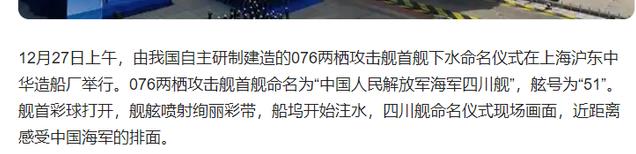 信息来源:参考消息2024-12-28美媒关注中国“四川舰”下水