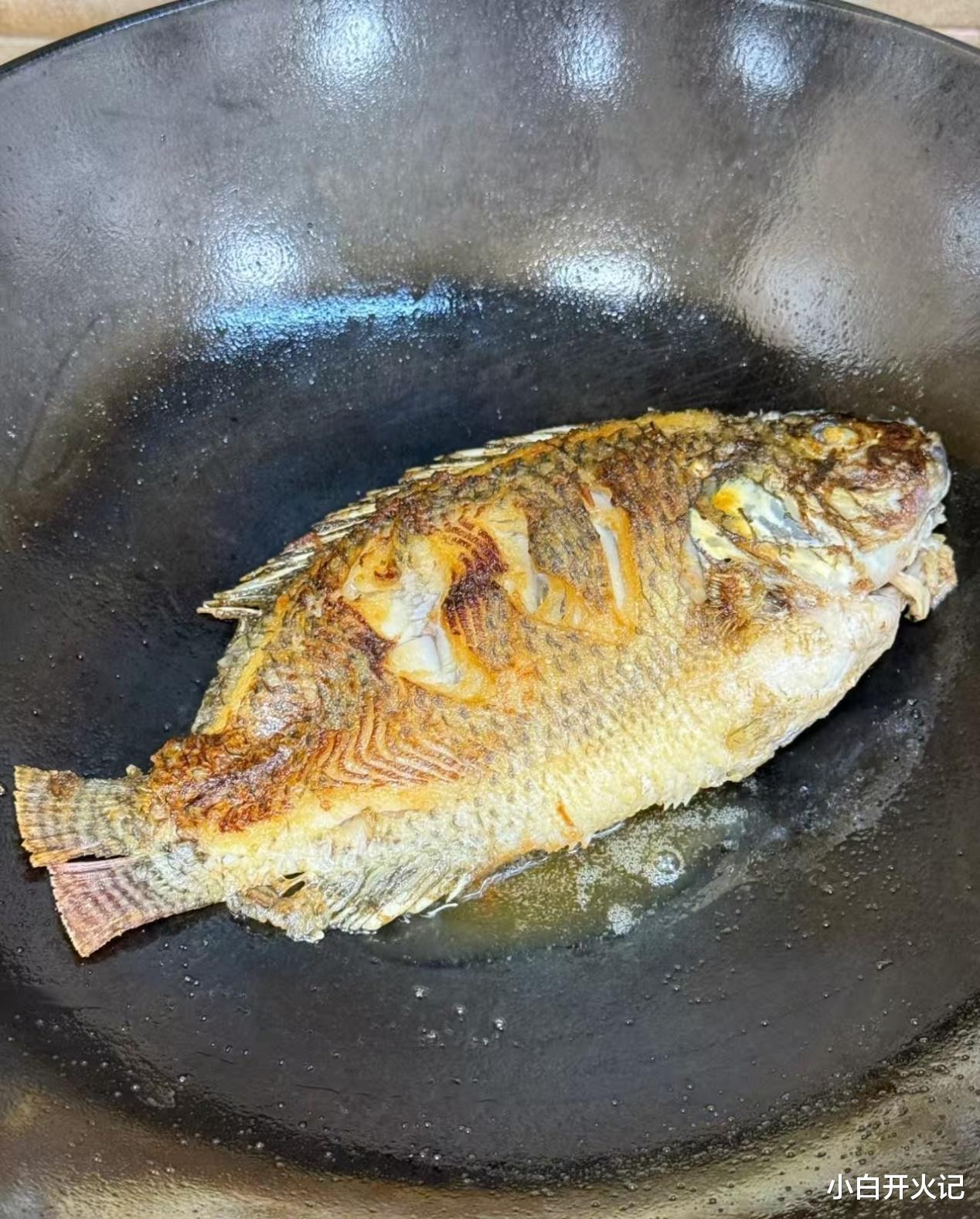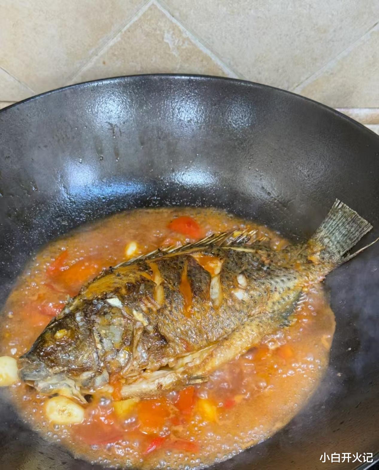 现在请福寿鱼出场。先把腌好的鱼用厨房纸按干表面水分,扑一层薄淀粉——别小看这一步,它是“脆皮”和“不溅油”的双重保险。热锅热油,把鱼轻轻滑进去,先别急着翻面,让它和油锅谈30秒恋爱,再用锅铲轻轻推,鱼皮自然脱离,两面煎到微焦,边缘泛起金黄色,香味飘得连阳台的猫都开始扒门。把煎好的鱼推到一边,下蒜末、姜丝、葱白爆香,再把之前炒好的番茄沙司倒回来,加一碗热水(刚没过鱼身即可),生抽一勺、蚝油半勺、糖一小撮、白胡椒粉抖三下,汤汁瞬间变成“夕阳色”,咕嘟咕嘟冒泡时,把鱼轻轻按进汤里,让它在番茄海里仰泳。