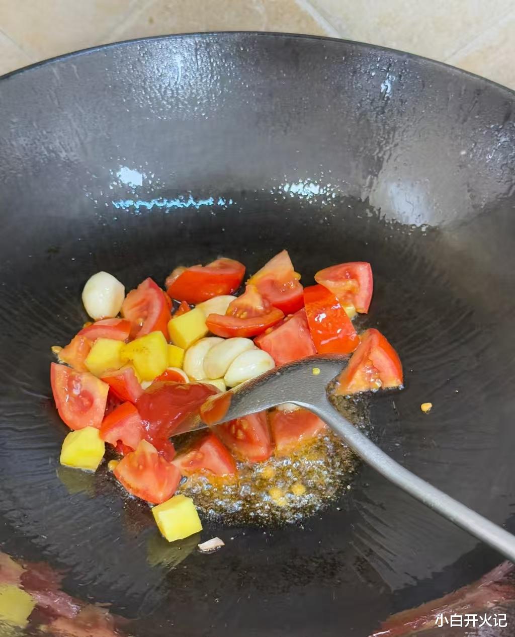 番茄是这道菜的灵魂,千万别客气,挑那种捏起来软软、表皮带点皱纹的“过熟”番茄,甜度最高。顶部划十字,扔进滚水里烫20秒,皮一撕就掉,切成丁,连汁带籽一起装进碗里,一滴都别浪费。接下来是“番茄加速器”:锅里放比平常炒菜多一丢丢的油,中小火烧到筷子插进去冒小泡泡,把番茄丁全倒进去,用铲子压一压,炒到“沙沙”出沙,颜色从鲜红变成深红,再加两勺番茄酱,瞬间把酸味和香气拉满,整个厨房都飘着“番茄味儿的快乐”。