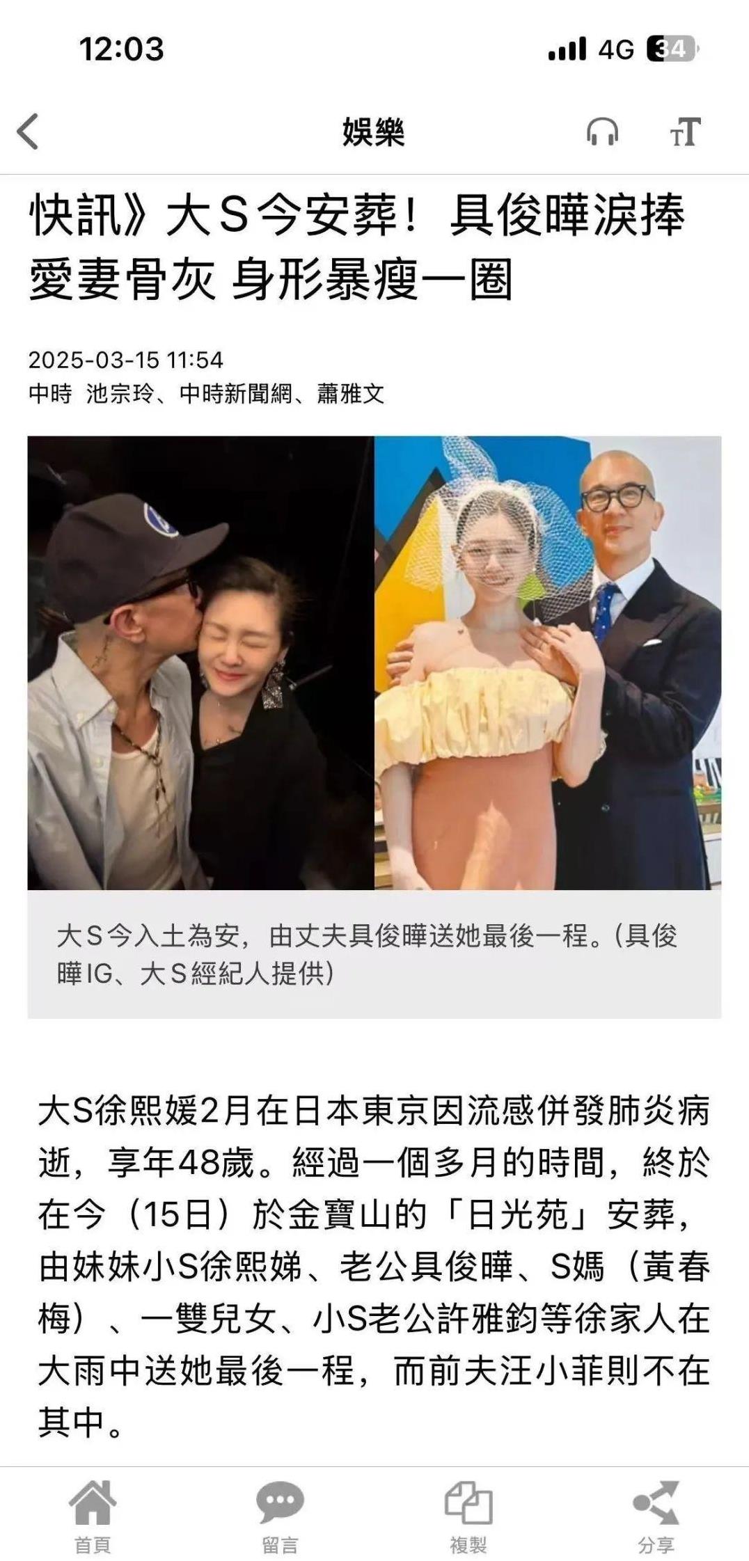 大S的遗产分配问题无疑是另一大焦点。具俊晔被曝仅支付七年塔葬费用,这一行为引发了广泛争议。有人认为这是精明的财产管理,也有人觉得这显得过于功利。无论如何,遗产分配问题再一次将家庭成员之间的利益冲突摆在了台面上。