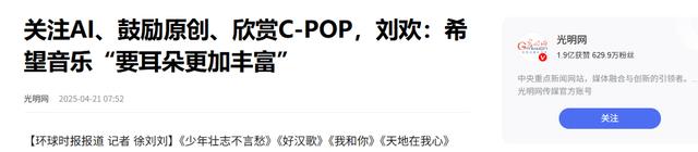信息来源:原文记载于光明网2025.04.21关于:关注AI、鼓励原创、欣赏C.POP,刘欢:希望音乐“要耳朵更加丰富”