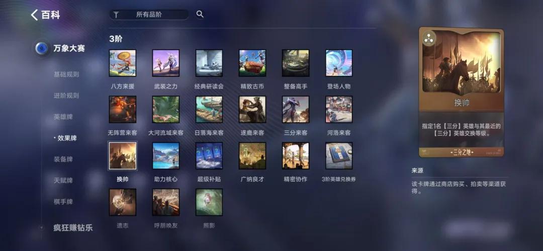 除了英雄自带的卡牌效果,万象棋还有很多单独的效果牌可以使用,比如「换帅」这张牌可以让「三分之地」阵营的两个英雄互换等级。当你打到大后期,突然抽到吕布,就可以用这张牌把已经养成的棋子跟吕布调换等级,让吕布立马变强,即插即C。