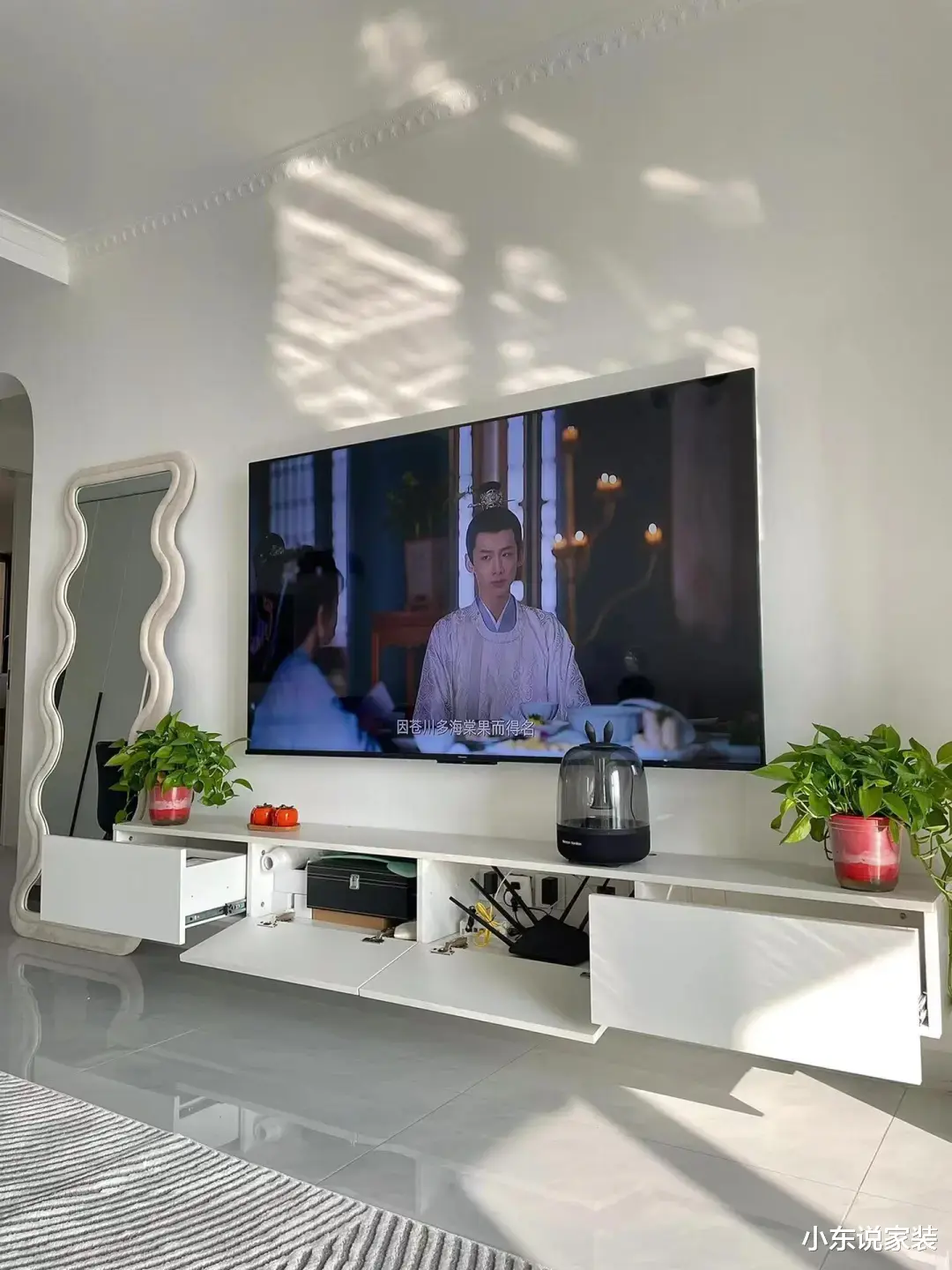 装修前期在墙里预埋50pvc管,便于穿各种电源线;然后电视柜做4等分,两侧做抽屉,用于收纳小物件。