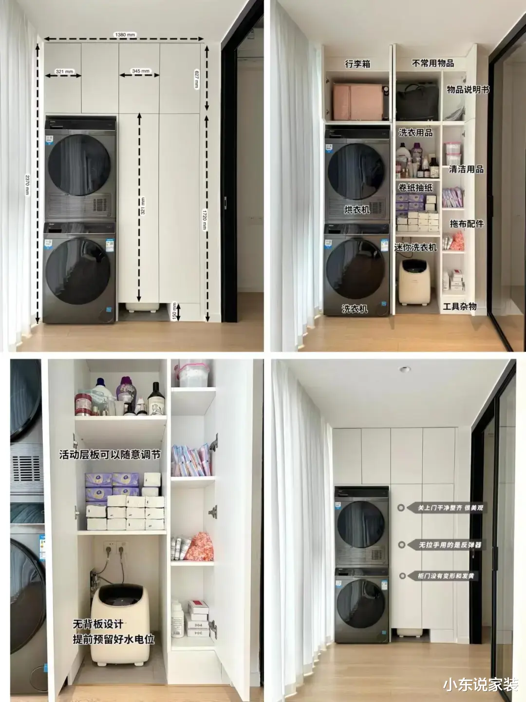 顶部区域,用来收纳不常用的物品,像家里的行李箱、伸缩梯子啥的;左侧区域,设计为洗烘套装叠放,右侧则是用于洗衣服的,清洁用品,包括洗衣粉、消毒液,还能囤各种纸巾。