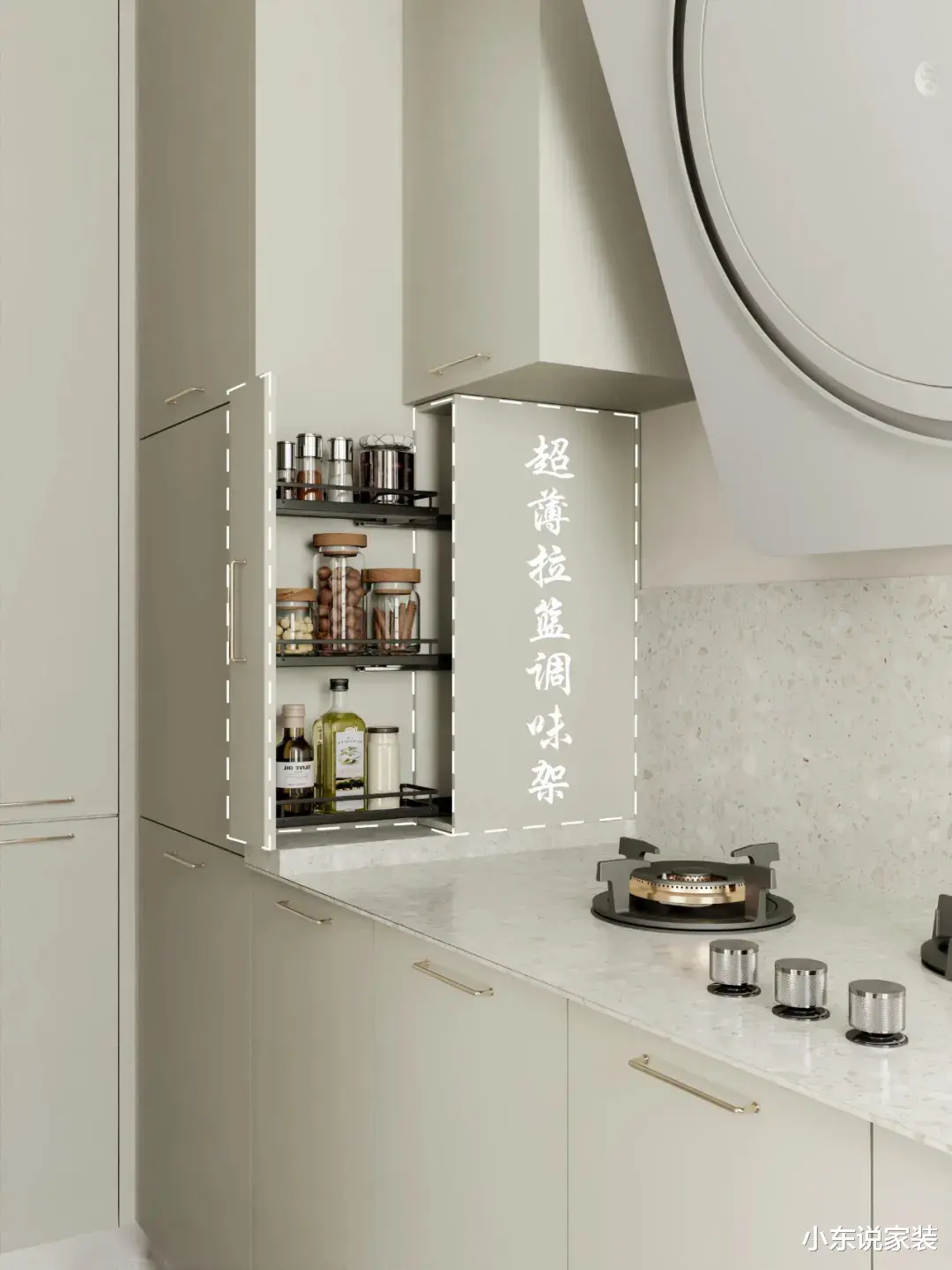 第二次装修,在台面上做了一个超薄侧拉柜,再搭配一个调味架,既不占用台面空间,又能收纳各种调味瓶。