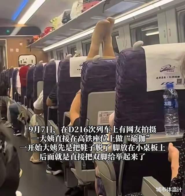 近日,一张拍摄于D216次高铁列车的照片引发热议。画面中,一位五六十岁的女士脱去鞋子,将双脚举过头顶,在车厢内旁若无人地练习起了“瑜伽”。更令人咋舌的是,她还将脚直接踩踏在前方小桌板和座椅靠背上,全程无人劝阻。