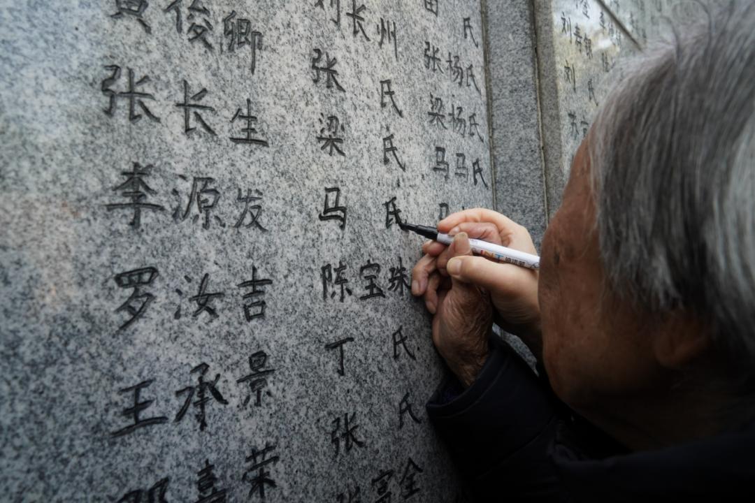 11月30日,南京大屠杀幸存者夏淑琴在“哭墙”上描名。图/新华社
