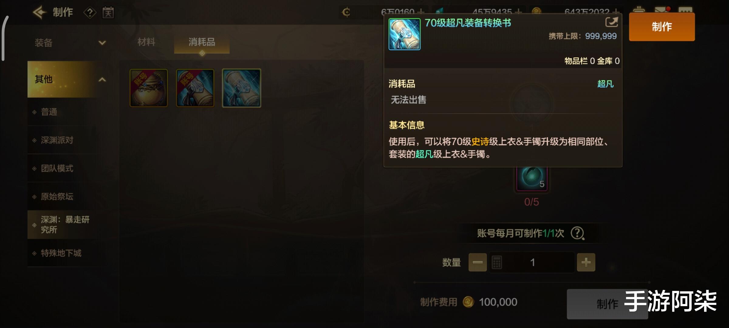 超凡装备的制作,首先可以使用换书残卷,将70级史诗上衣/手镯按指定概率升级为同部位、通套装的超凡装备,这个所谓的指定概率的话应该不会太高,失败了的话,原本的史诗装备不会变化,换书残卷消失,获得一个超凡之息,只要失败5次,获得5个超凡之息,就能制作一本70级超凡装备转换书,使用后直接将70级史诗上衣/手镯升级为同部位、通套装的超凡装备。