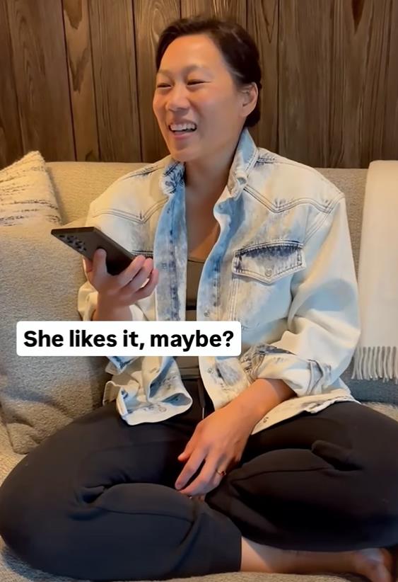 扎克伯格还晒出了几张妻子收到礼物时的照片,39岁的华裔妻子普莉希拉.陈穿着浅色牛仔衣,搭配黑色裤子,光着脚盘腿坐在沙发上。一副居家随意的样子,一点儿也不介意老公将这样的自己晒给所有人。尤其是,普莉希拉.陈盘着发,更是一脸全素颜,笑着面对镜头。虽然普莉希拉.陈颜值不高,但是自信的样子却真的很美。