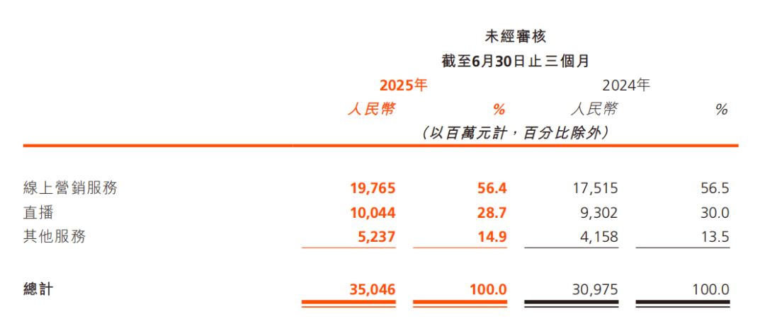 2024年,快手直播业务收入同比下滑5.1%至371亿元,其营收占比从34.5%降至29%。2025年第二季度,直播业务8%的增速依旧跑输大盘,占比进一步降至28%。