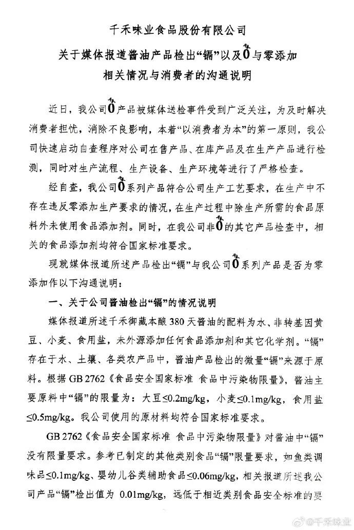 一、检测报告惊雷:一瓶酱油里的致癌物疑云北京方圆检测实验室的化验单显示,千禾“零添加180天”酱油中的镉含量虽未超过《食品安全国家标准》(GB2762-2022)中调味品镉含量≤0.1mg/kg的规定,但其数值却是同批次检测酱油平均值的2.4倍。