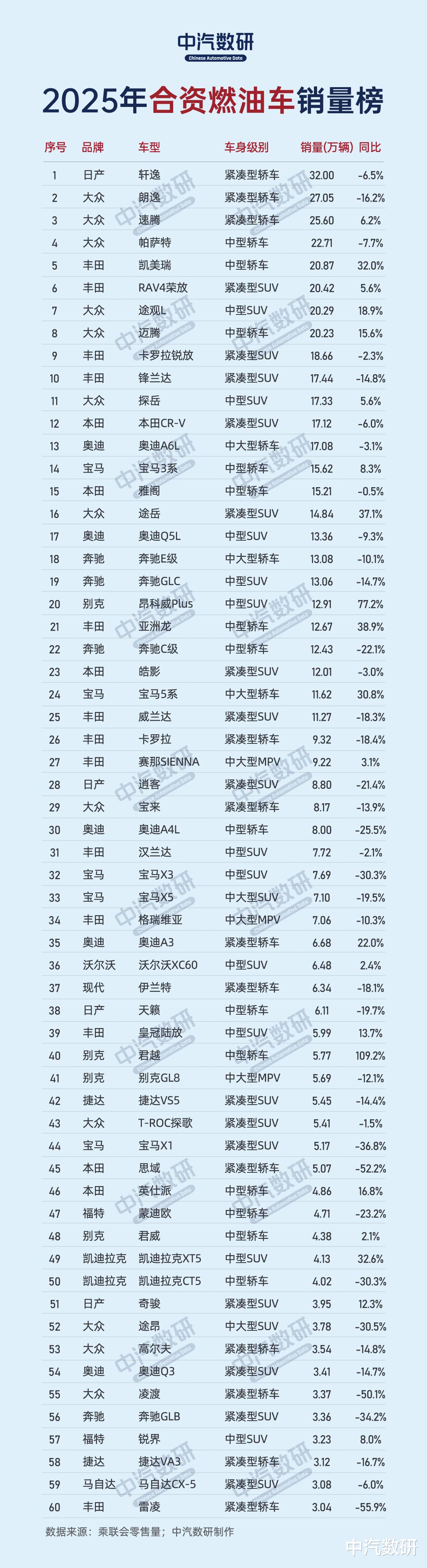 2025年合资燃油车TOP60中,紧凑型轿车占比近一半,日产轩逸以32万辆蝉联榜首(同比-6.5%),大众朗逸(27.05万辆,-16.2%)、速腾(25.60万辆,+6.2%)紧随其后,尽管多数车型同比下滑,但仍是合资品牌的核心销量来源。
