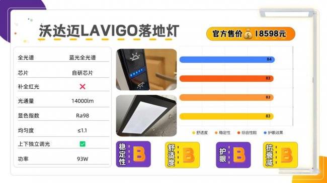 护眼大路灯第七名:沃达迈LAVIGO落地灯;能够呈现14000lm的光通量,亮度表现充足。