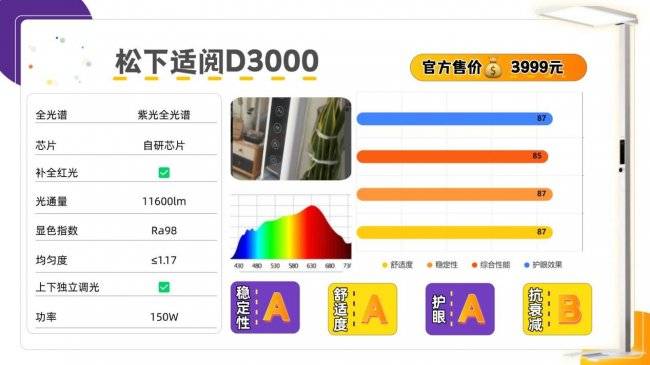 什么牌子的大路灯护眼好用又便宜?松下适阅3000与书客SUN Pro一样,采用的是紫光激发方案的全光谱护眼灯,内置SunLike紫光芯片,通过紫光激发来规避传统蓝光灯珠容易形成的高峰蓝光问题,从光源层面降低有害蓝光比例,硬件配置上,整灯搭载约420颗全光谱灯珠,整体光通量约为11600lm,并在发光面加入了抑制眩光的表层处理,使照射范围更宽、光线分布更均衡,整体表现不错,要是在重影上能够优化一下就更好了。