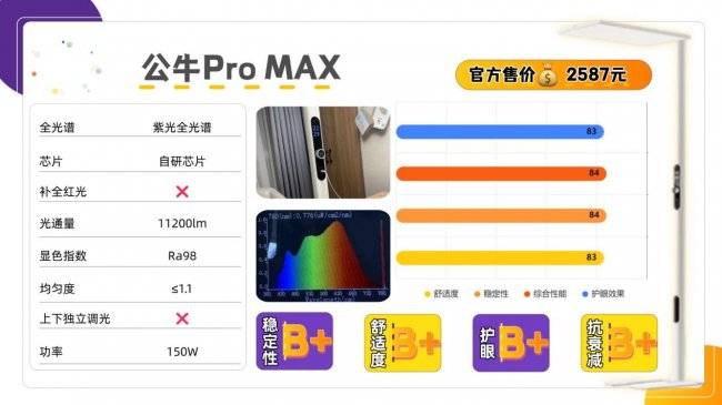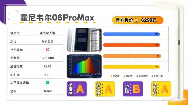 什么牌子的大路灯护眼好用又便宜?霍尼韦尔06 Pro Max属于系列中的高配型号,UGR控制在9以下,搭配Ra97显色指数,使光线更柔和,同时色彩还原效果也不错,亮度方面,整灯光通量提升至约17500lm,可覆盖约25㎡的空间。需要注意的是,虽然定位顶配,但光谱方案中并未加入红光补偿,对于对全面护眼效果有较高需求的用户来说,这款价格比较高的护眼大路灯并不是最佳选择。