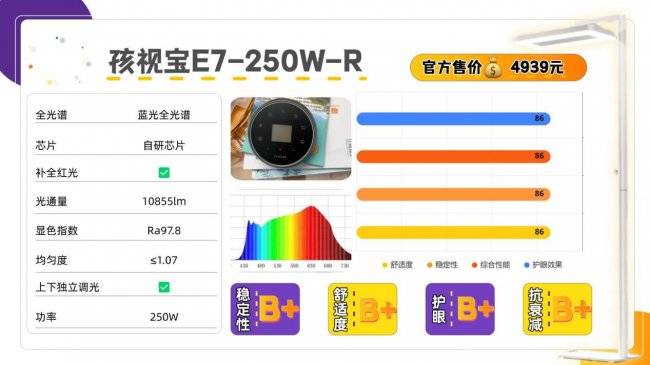 什么牌子的大路灯护眼好用又便宜?孩视宝E7-250W在光学设计上采用上、中、下三向出光方式,以提升整体照明的覆盖范围和均匀度,顶部配备四重透镜光学系统,侧面加入环形补光结构,多维漫射让光线更柔和,使室内光环境更平衡舒适, 功能方面增加了节律照明模式,可模拟自然光随时间变化的节奏,不过作为系列顶配型号,其价格偏高,整体性价比一般,更适合对配置有较高要求的伙伴选购。