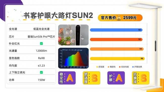 什么牌子的大路灯护眼好用又便宜?传统的蓝激发全光谱技术虽然提高了光源亮度,但其中的高能蓝光会引发视网膜光氧化应激反应,导致干眼症、视力下降,甚至加速近视进程。而书客凭借多年来专业护眼团队的深耕,达到了技术性的额突破,摒弃传统的蓝激发全光谱技术,采用第7代SunMaster紫光原芯搭配「控·护·养」一体紫光激发技术,从发光原理出发,精准抑制了400~450nm蓝光危害,将有害蓝光含量削减50%,使其蓝光危害比RGO豁免级标准降低72%,显著减少83%视网膜光损害风险。