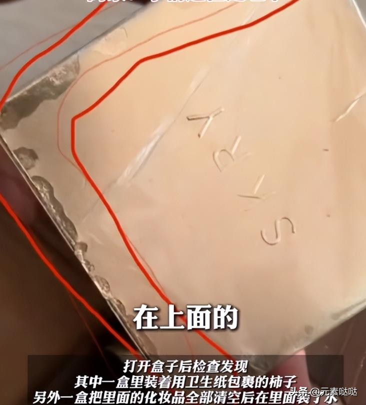 她打开手机录像,记录下了拆包的全过程,盒子里没有面霜,取而代之的是一个已经腐烂渗水的柿子,以及一个被掏空内容物、灌满自来水的面霜空瓶。
