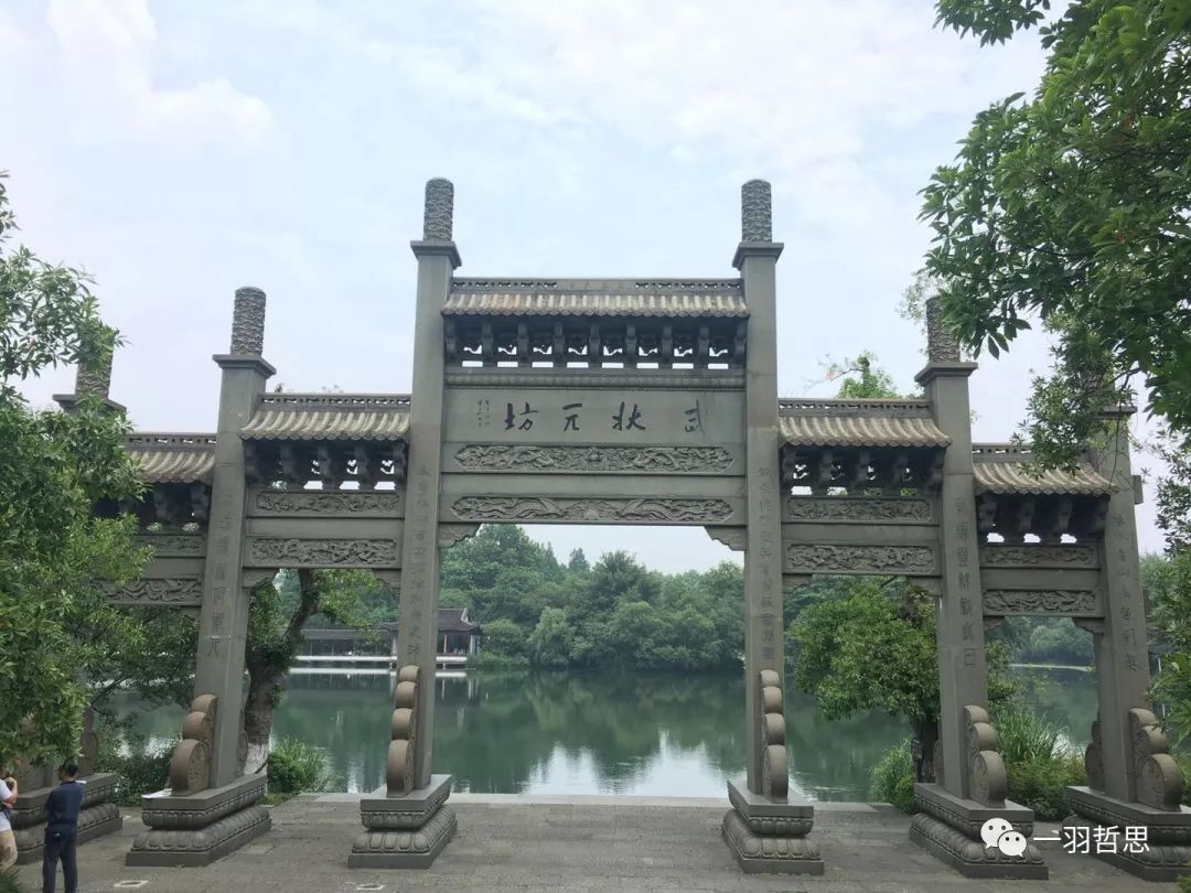 从虎跑路一个不起眼的口子进入,沿着三台山路往里走,不多久便到了浴鹄湾,一个静静的港湾,西湖闹中取静的地方,透过湖面可以看得到苏堤。一座高大的牌坊矗立在那里,便是武状元坊。平时数次路过而未驻足,中午有点时闲便有了探究的念头。