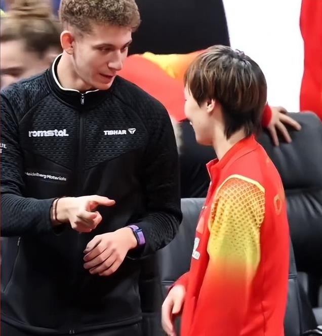 值得一提的是,国乒队员们挨个和罗马尼亚队员们击掌的时候,对方其中一位男队员从最开始就一直紧紧盯着远处的王曼昱;