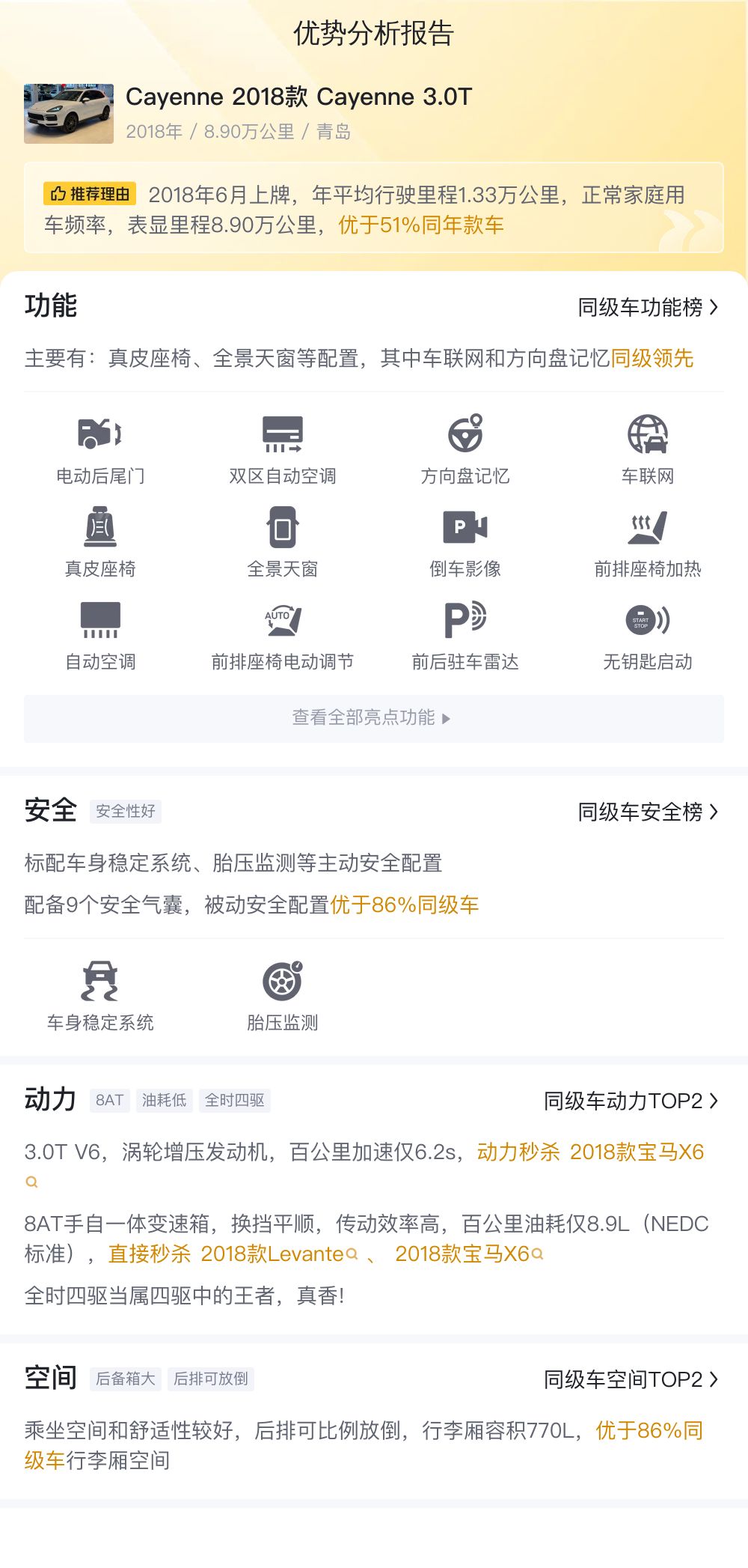 综上所述,这辆Cayenne 2018款 Cayenne 3.0T在市场行情、用车成本、优势分析等方面都表现出色。您可以将此作为参考,做出自己的选择。