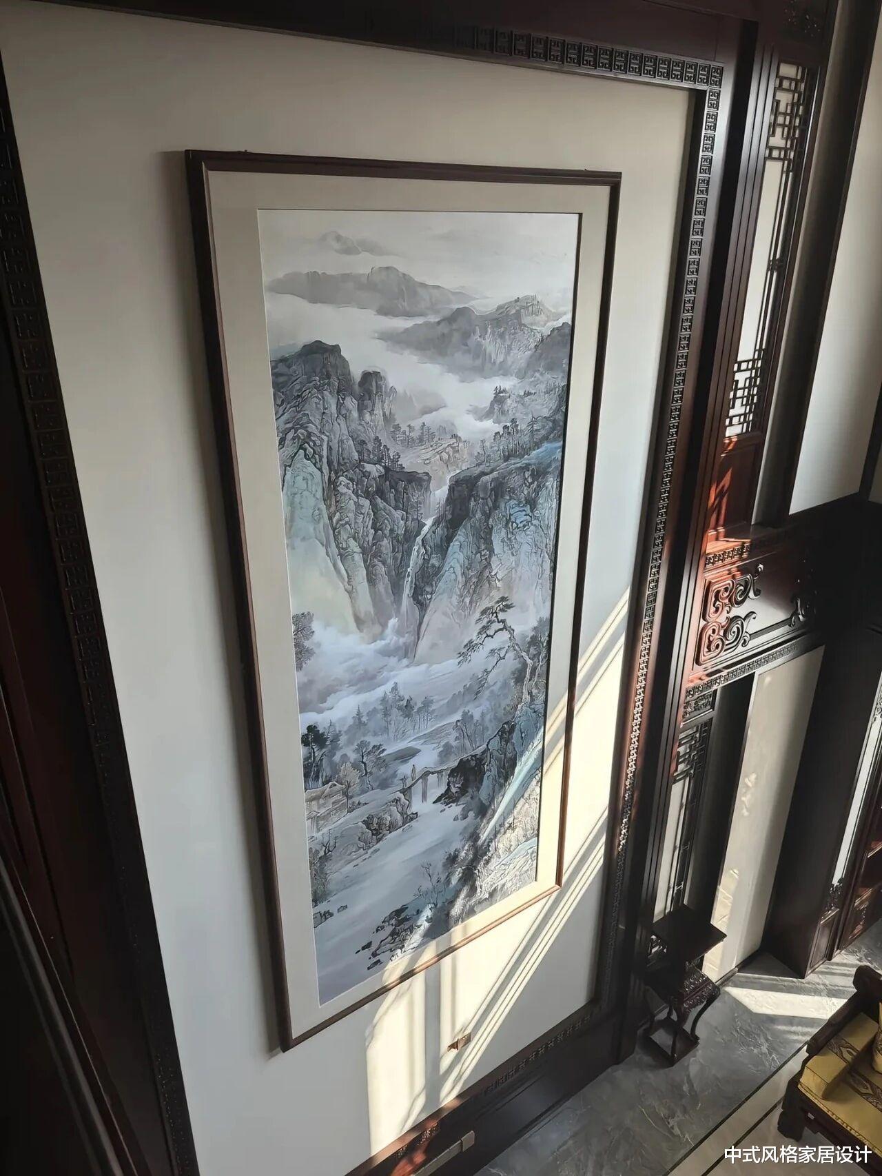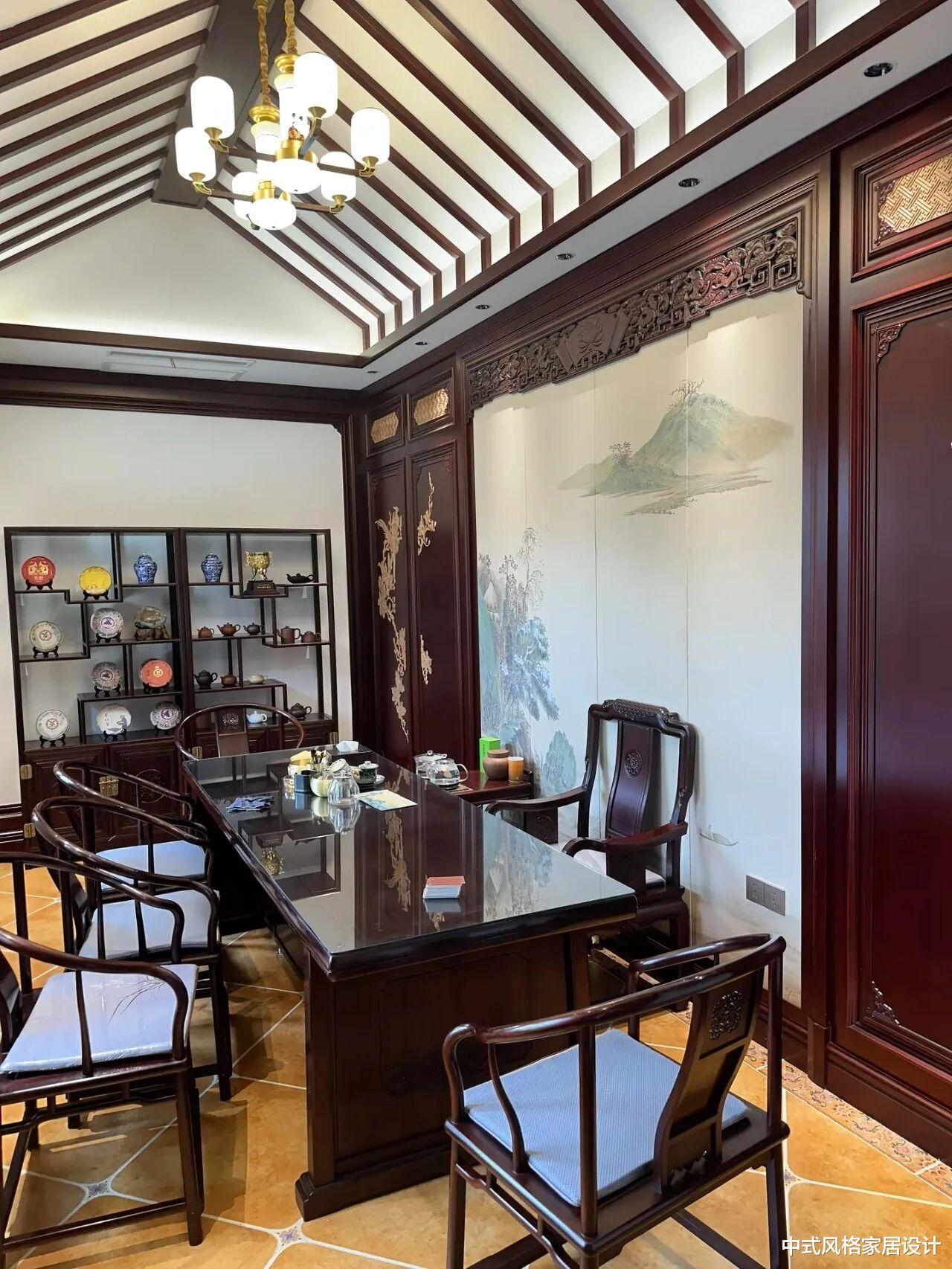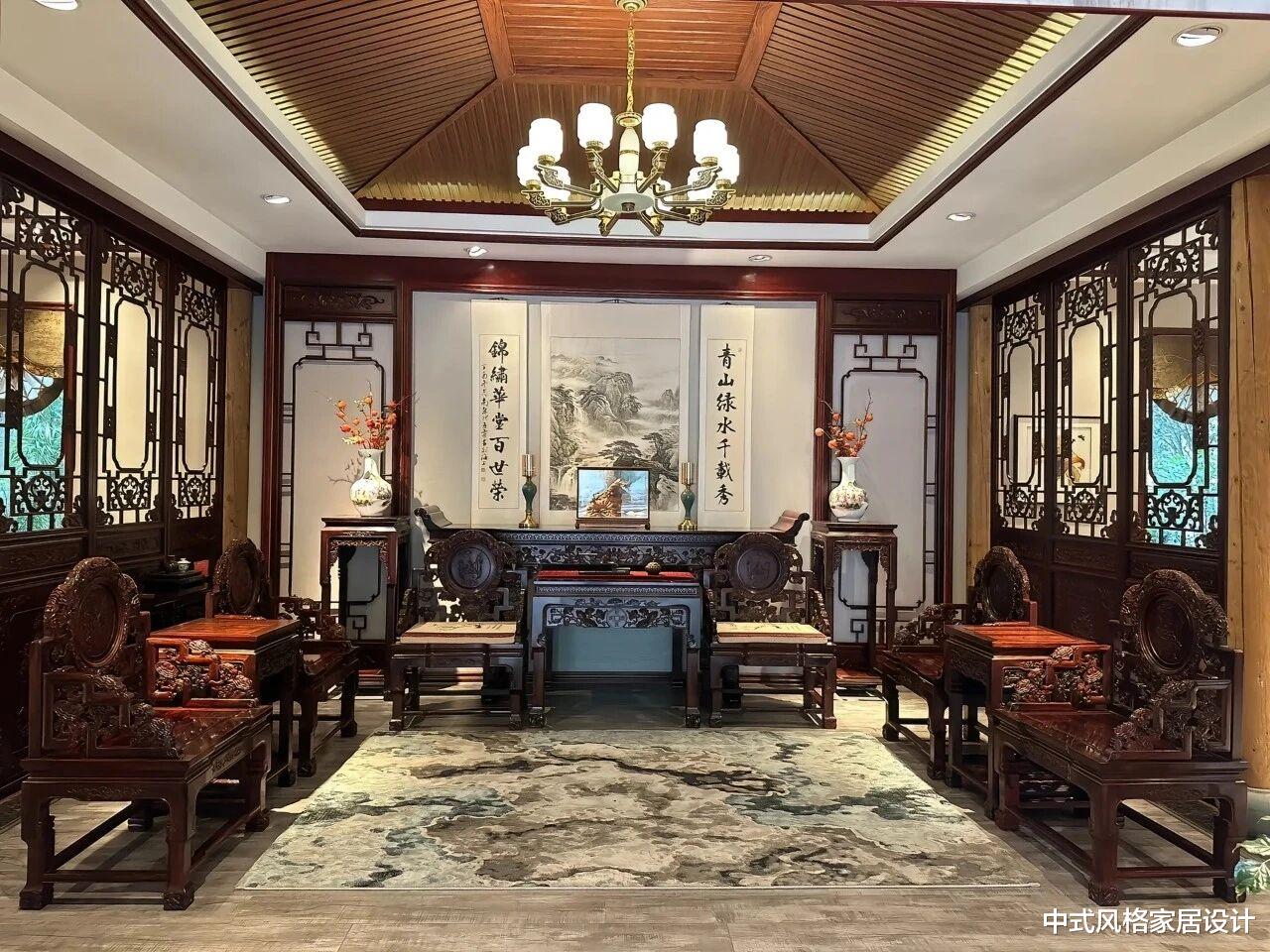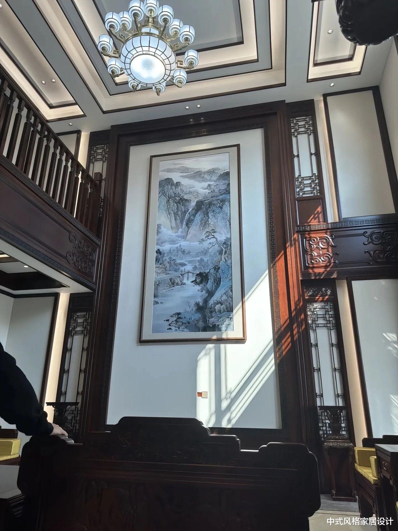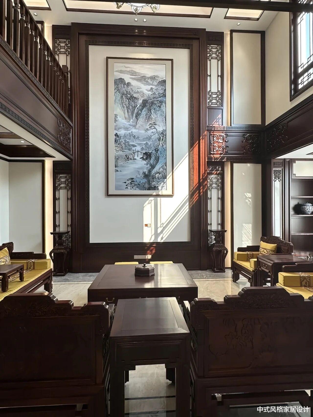 中式别墅客厅,整体以深色实木为基调,展现东方韵味。中央摆放雕花实木桌椅,线条古朴;两侧设木质博古架,搭配镂空雕花屏风,尽显传统工艺细腻。正墙面悬挂水墨山水画,墨色山水与留白营造悠远意境;两侧格栅窗引入天光,光影透过窗棂在地面形成斑驳纹路,增添空间层次感。整体设计融合传统中式美学与现代别墅空间感,实木材质的温润、山水画的意境及格栅窗的光影,共同营造出沉稳雅致的东方禅意氛围。