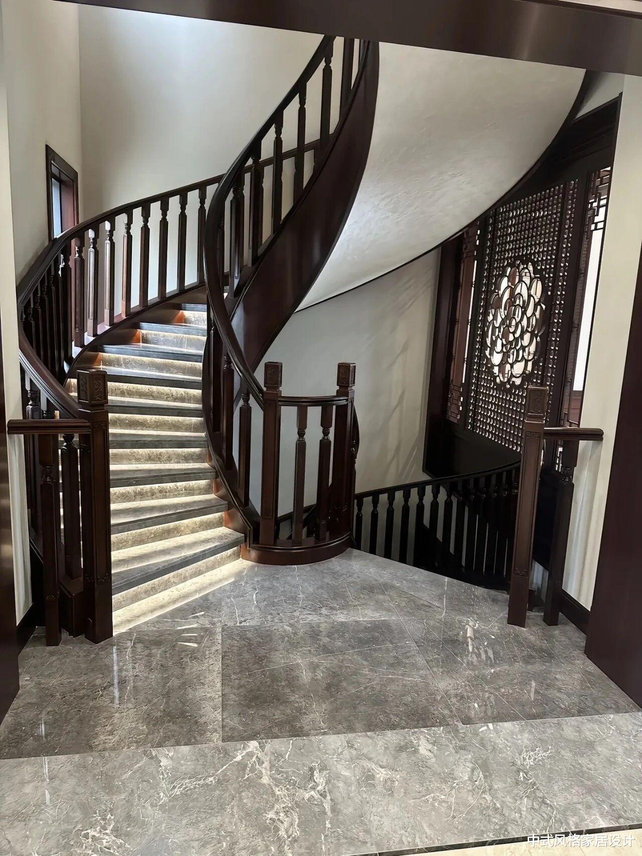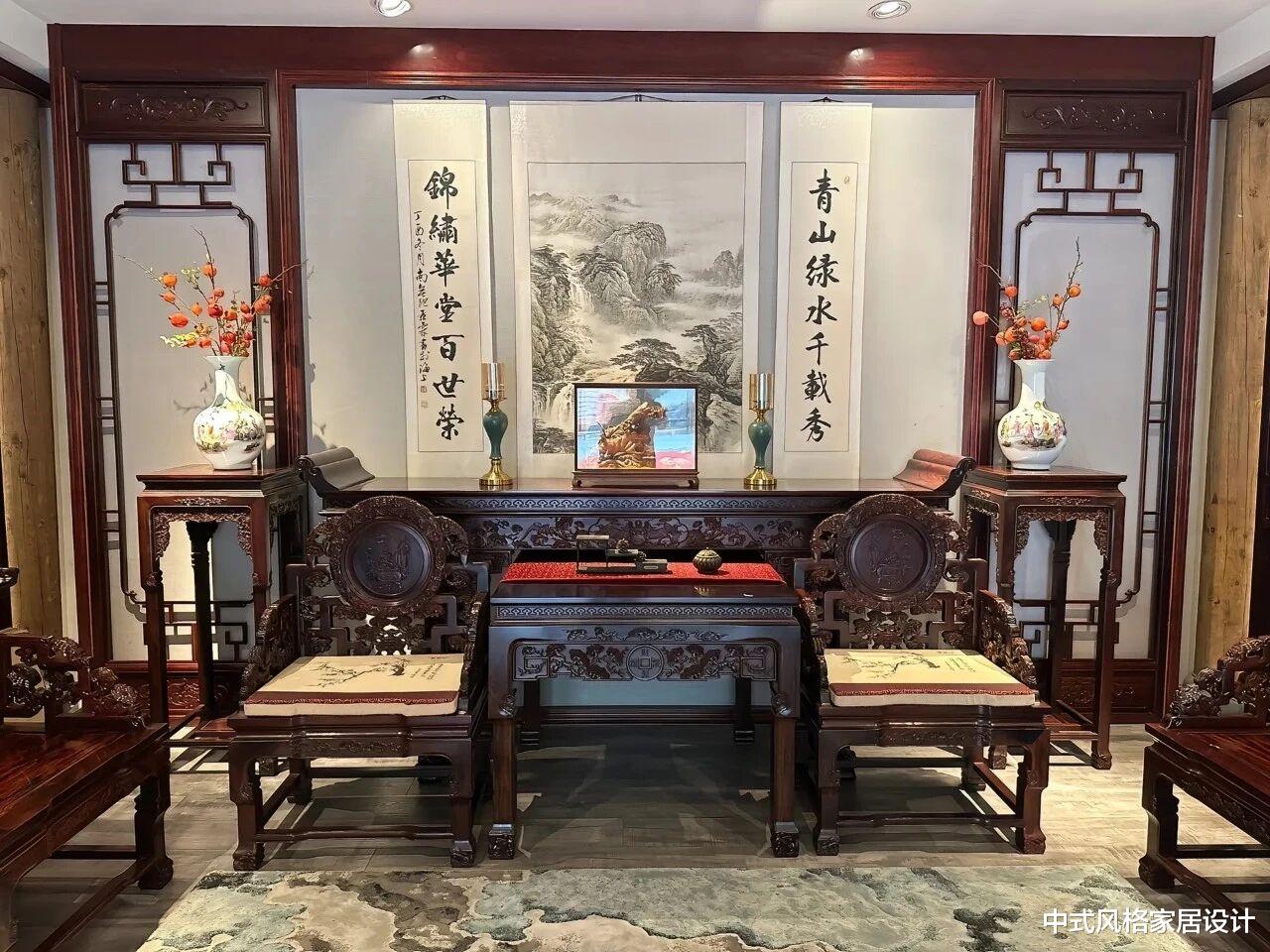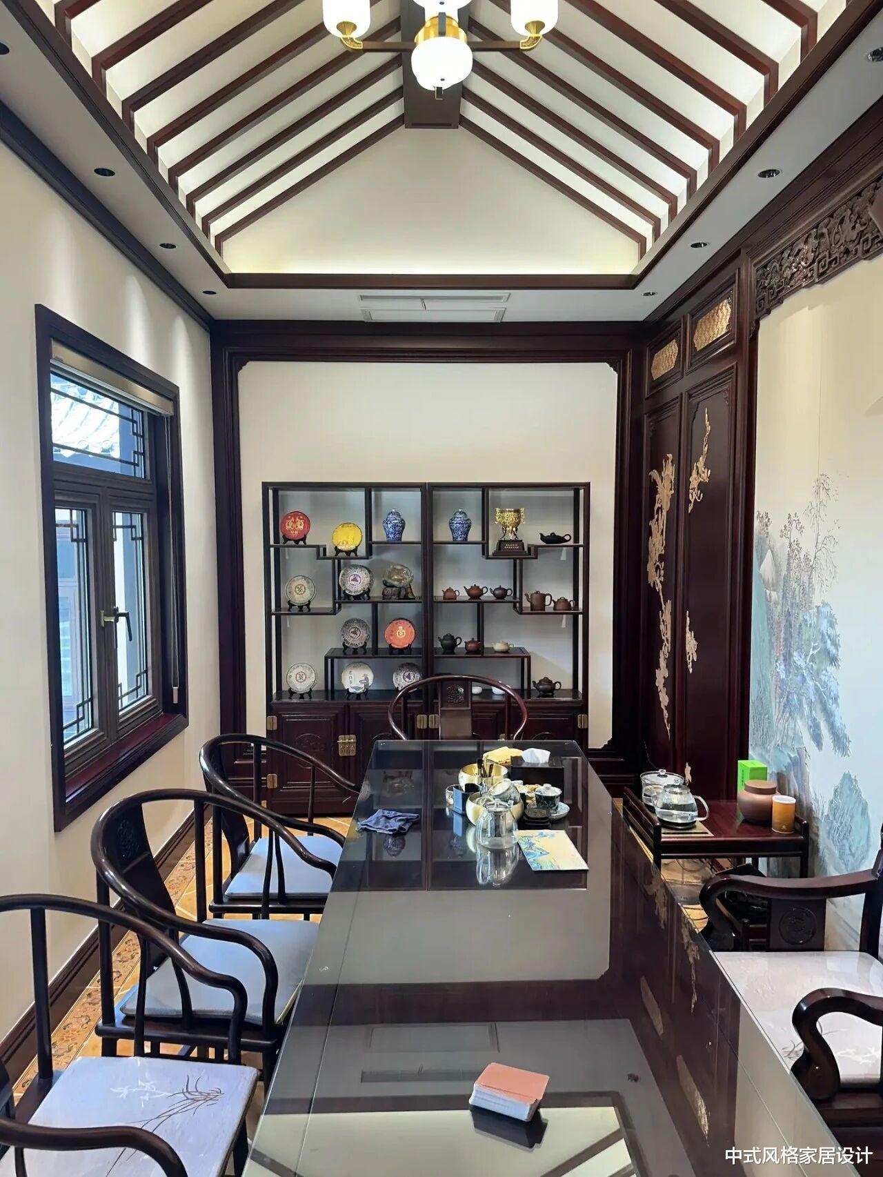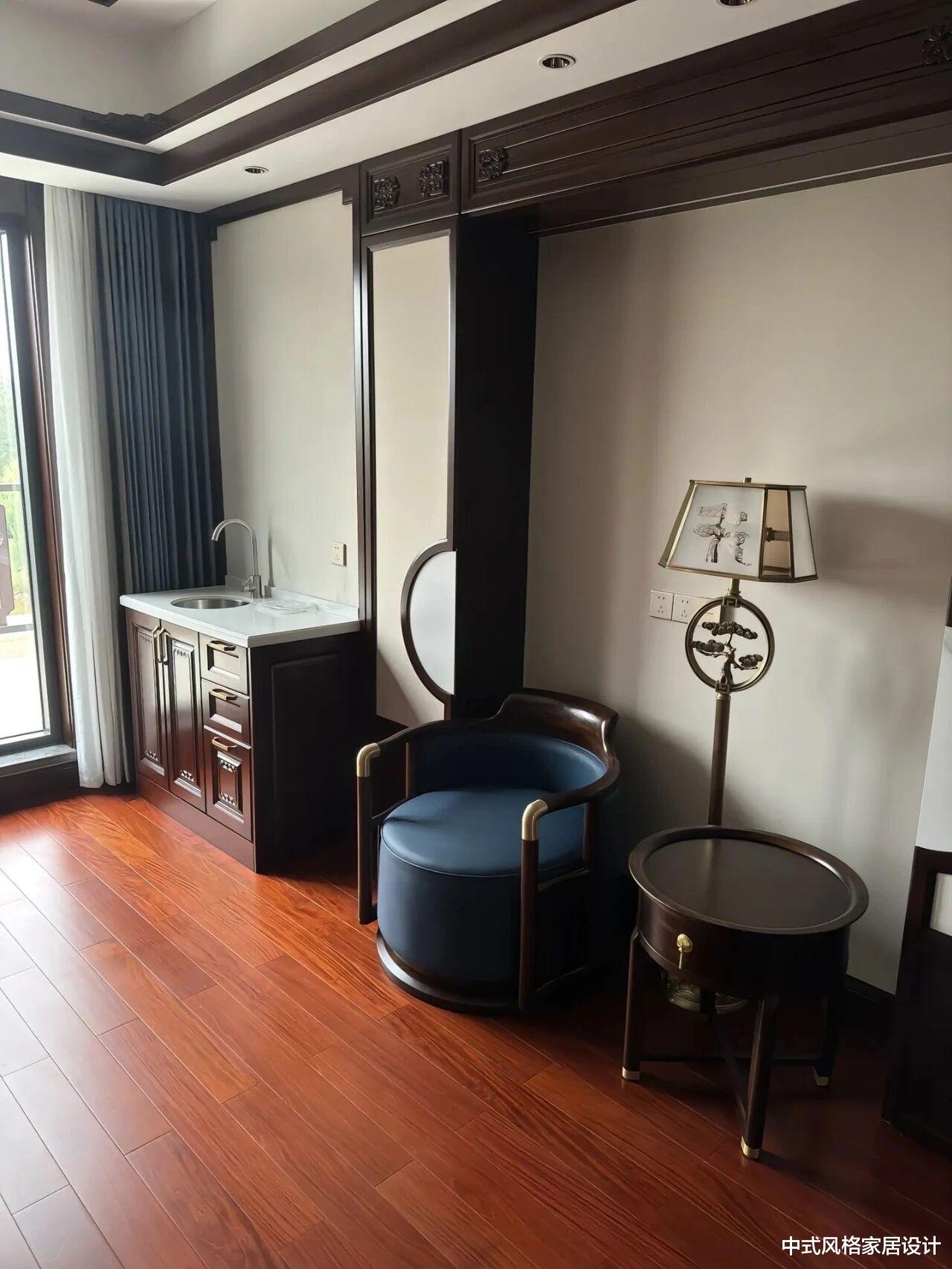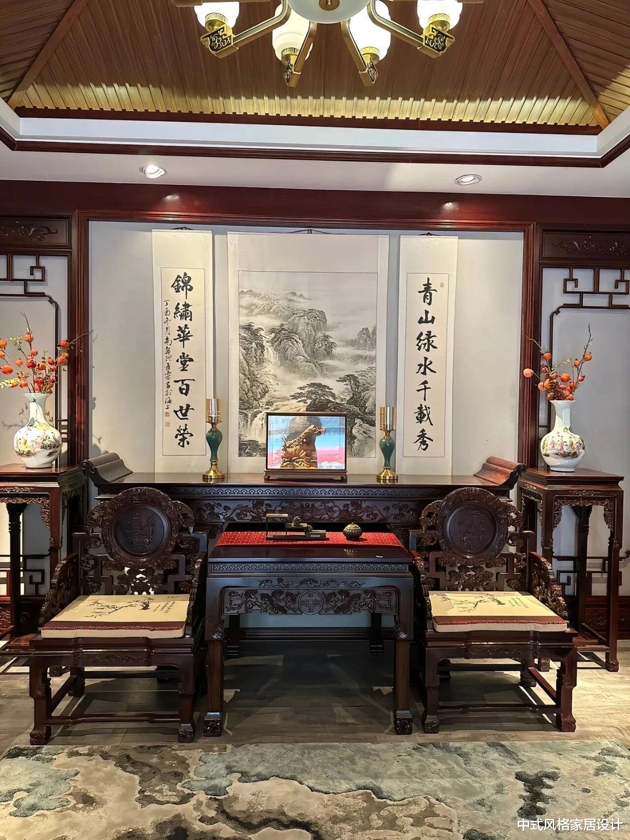 中式别墅客厅,整体以深色实木为基调,展现东方韵味。中央摆放雕花实木桌椅,线条古朴;两侧设木质博古架,搭配镂空雕花屏风,尽显传统工艺细腻。正墙面悬挂水墨山水画,墨色山水与留白营造悠远意境;两侧格栅窗引入天光,光影透过窗棂在地面形成斑驳纹路,增添空间层次感。整体设计融合传统中式美学与现代别墅空间感,实木材质的温润、山水画的意境及格栅窗的光影,共同营造出沉稳雅致的东方禅意氛围。