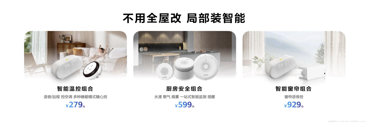 如果你只是想在某个场景先试试水,华为鸿蒙智家还提供智能温控组合、厨房安全组合、智能窗帘组合等局部改造入门套装,百元级价格即可上手:比如智能温控组合适合对室内舒适度有要求的家庭,安装后家里的老旧空调就能变身智能空调,通过语音或华为智慧生活APP调控温度;厨房安全组合,特别适合家里有老人常做饭的家庭,燃气泄漏、烟雾浓度异常都能及时预警;智能窗帘组合则是追求生活品质的第一步,早晨自动拉开窗帘迎接阳光,不需要大体量改造工程。