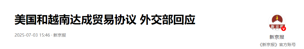 美国和越南达成贸易协议 外交部回应,2025-07-03 15:46·,新京报