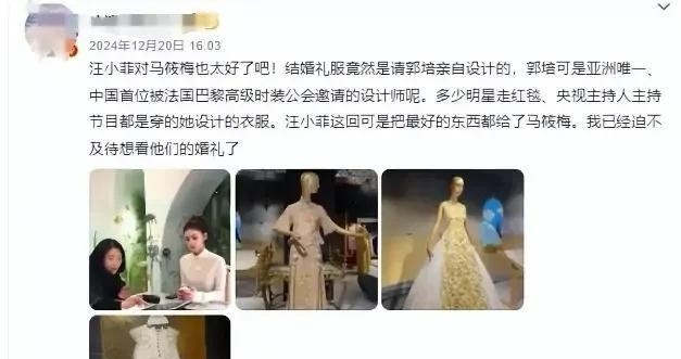 汪小菲的妈妈张兰对这场婚礼也很重视。张兰是做餐饮生意的,很有名气。她和郭培是好朋友,所以特意请郭培为儿媳妇设计婚纱。张兰看起来很喜欢马筱梅,婚礼上一直笑眯眯的,还亲自招待来宾,看得出她对这个新儿媳妇很满意。