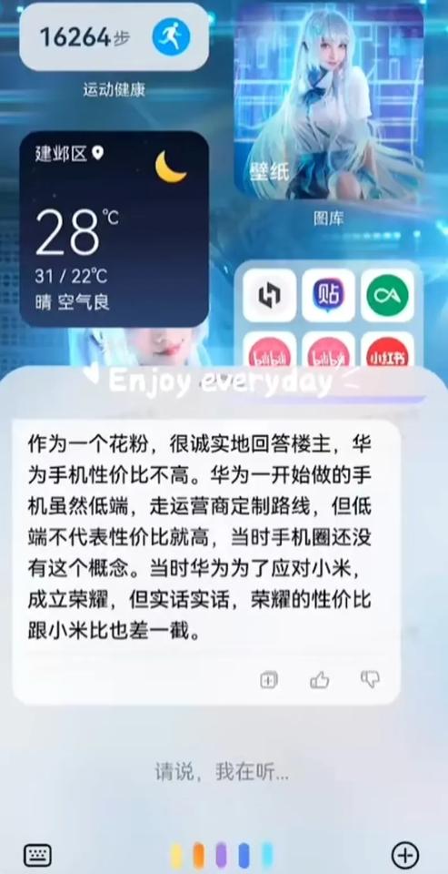鸿蒙4.0,唤醒你们的小艺,问它三个问题,“如何果评价苹果手机”“华为手机有性价比嘛”“小米手机有性价比嘛” 华为开始做低端,从运营商定制做起,但低端不代表性价比高。这时候才有了荣耀,性价比也比小米差一截。就这人工智能的回答,就比一些网友格局大多了。