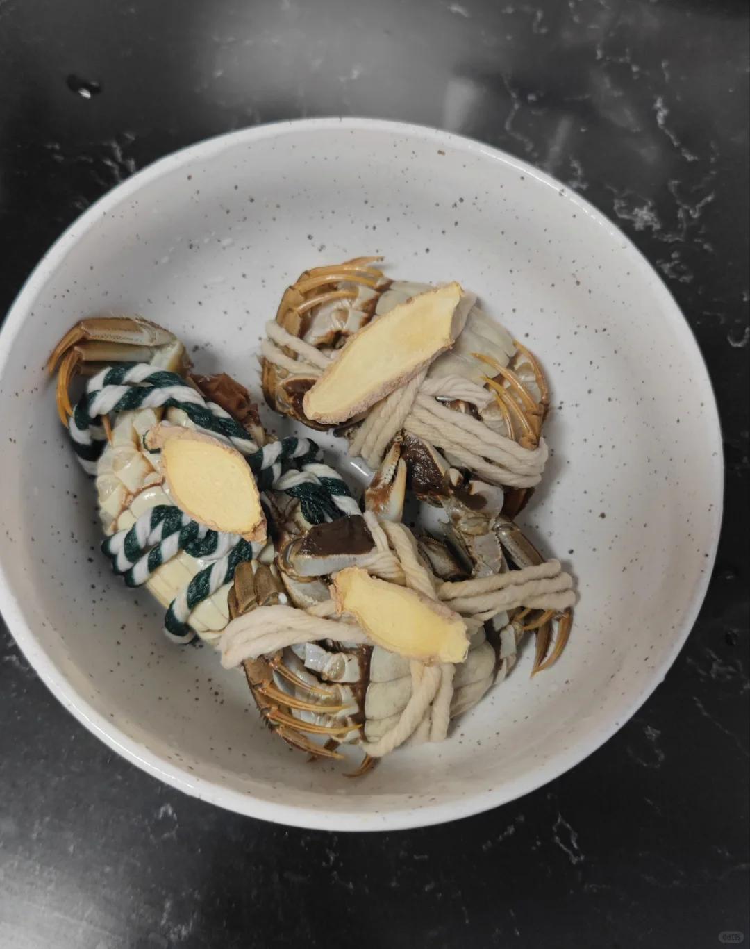 先在碗中注入适量清水,再将螃蟹腹部朝上摆放,适当添加些料酒与姜片以增香去腥。