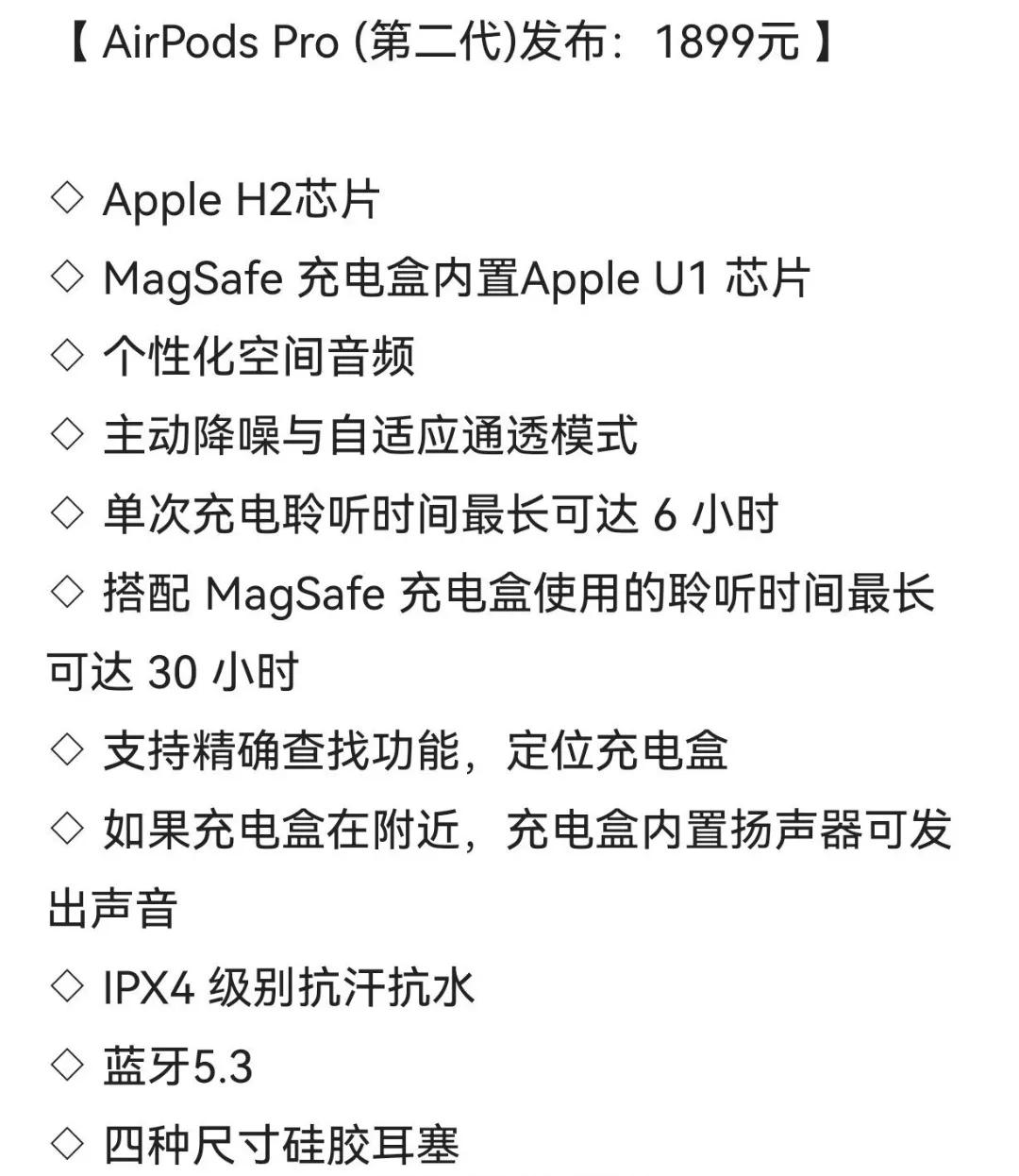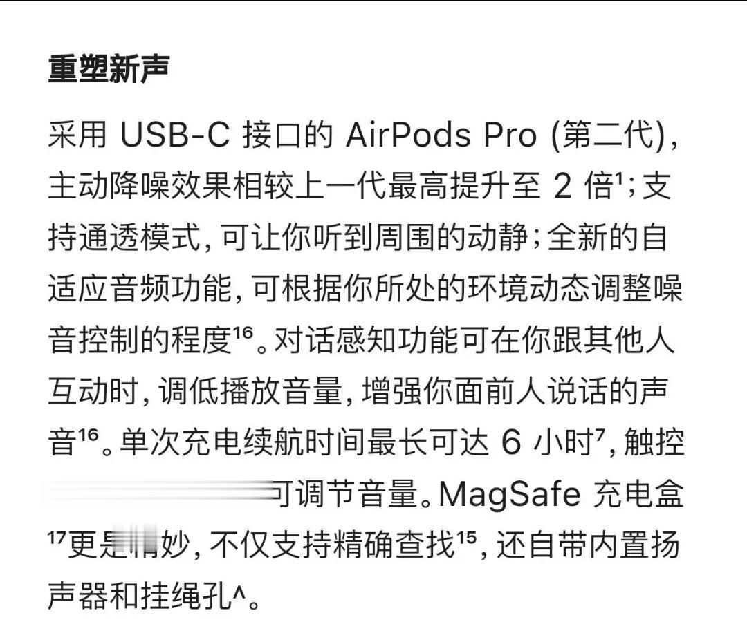 苹果发布USB-C接口的AirPods Pro (第二代),售价仍为1899元。 苹果这换代太简单了,先换名字,再换充电口,下一代换个扬声器,再换个颜色,高刷和快充起码得2026才给你,