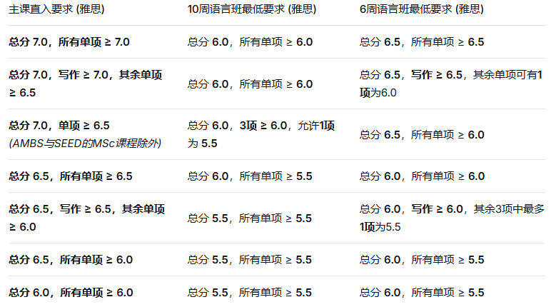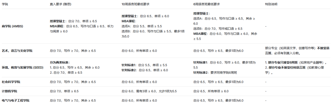 曼彻斯特大学2026年入学授课型硕士的语言要求与语言班政策已按学院更新。为方便查阅,核心信息汇总如下表:
