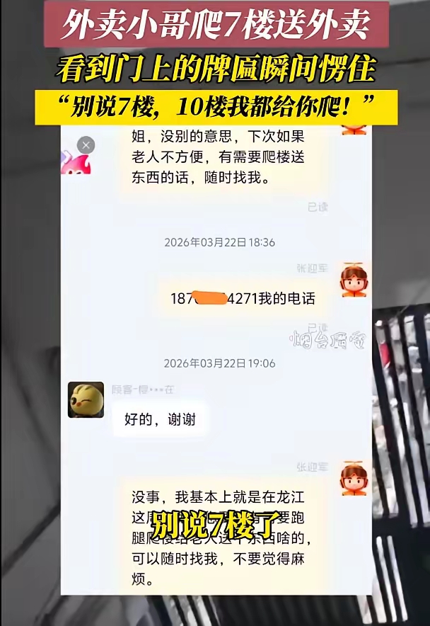 就在他犹豫的时候,看到订单备注上写着:家里父母年纪大了,腿脚不方便,麻烦送到门口,看到这句话,张师傅心里软了一下,心想老人家下楼确实不容易,自己辛苦点也就爬了。