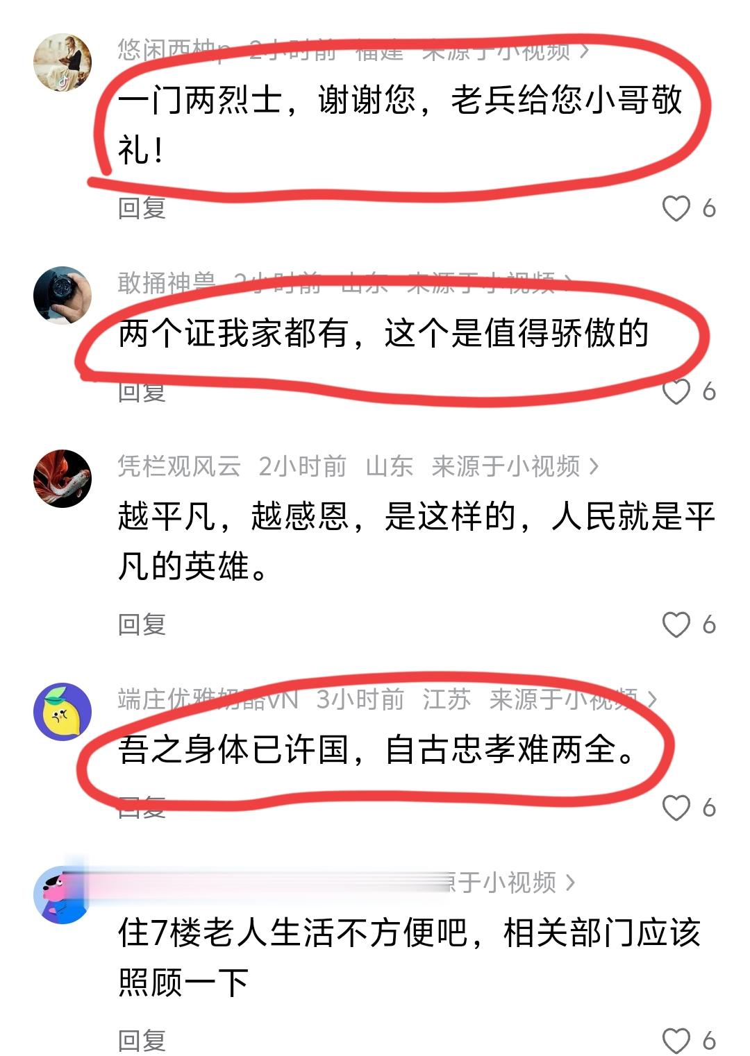 这两个词像重锤一样敲在他心里,他瞬间意识到,这户人家不仅是普通的军属,更是为国家捐躯的英雄父母,两位老人住在这种没电梯的高楼,生活里的难处恐怕比爬楼多得多。