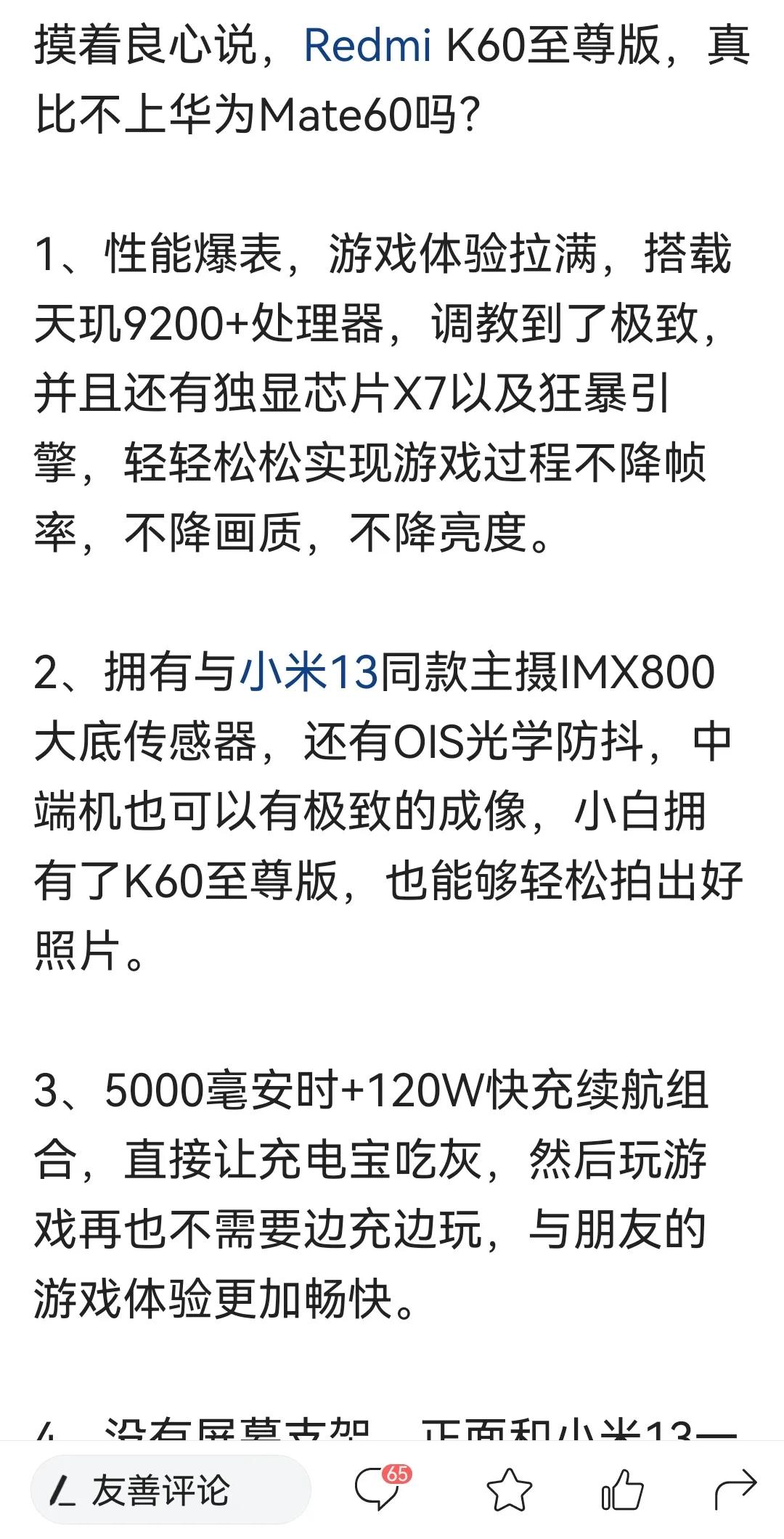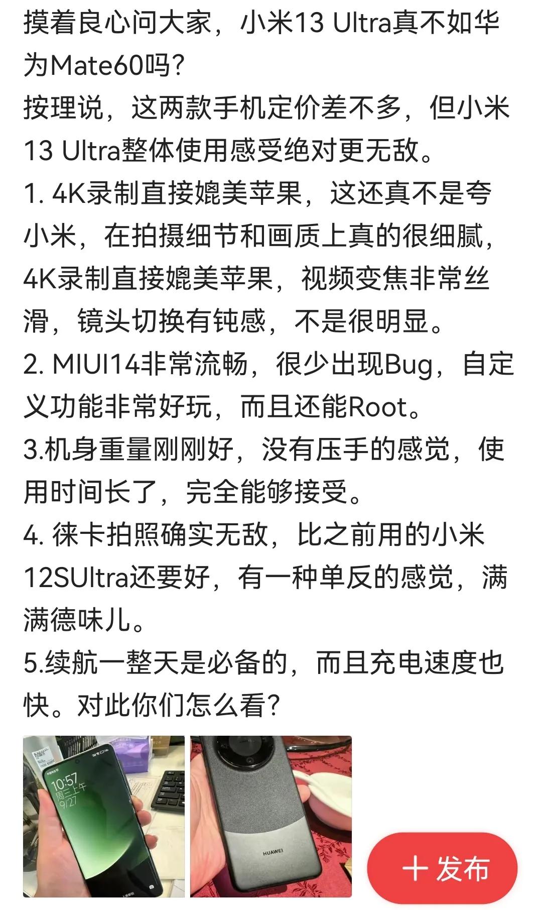 又来了,上次小米发布新一代小米折叠屏后,网络上就好多“余承东彻夜难眠”“余承东被狠狠打脸”“余承东开始慌了”这次华为mate60系列发布,这下又变开头了“摸着良心说”然后就列举一大堆的小米产品的参数,华为的昆仑玻璃,卫星通话,xmage就一点不提,我就没搞明白,这些博主说小米为啥一定要带上华为了?他们的客户群体重叠嘛?他们的定位重叠嘛?这样算不算引战引起两边粉丝互喷? 小米有小米的优势,华为有华为的坚持。消费者想买啥就买啥,一定要弄成粉丝互骂嘛?万一将来,他俩合作了怎么“摸着良心说”