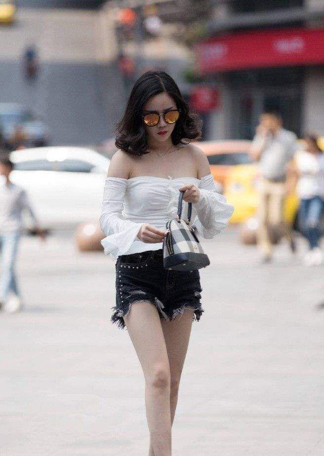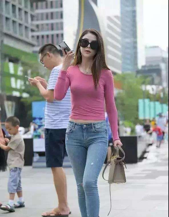街拍:美女身穿紧身上衣,搭配破洞牛仔裤,让人忍不住多看了几眼