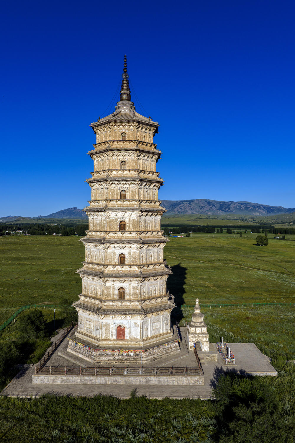 暮色降临时,塔下的敖包开始升起炊烟。牧人的马头琴响起,调子和塔檐的铜铃莫名合拍。这时候再看白塔,它已经融进了渐渐暗下去的草原,只有塔顶的鎏金还在固执地亮着,像一颗不肯熄灭的星。或许千年前的辽兴宗也曾这样站着,看着他的塔,想着他的母亲,而现在,你站在这里,想着你的心事——一座塔能连接多少人的心事?这可能才是它最动人的秘密。