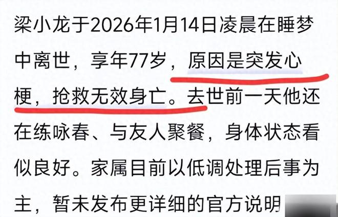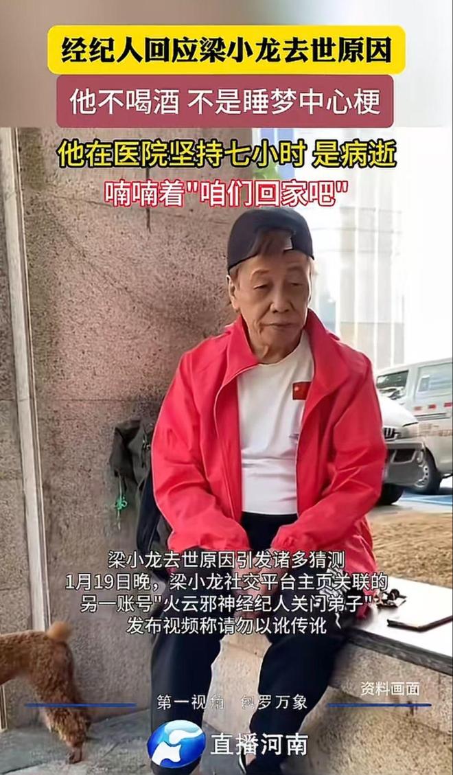 不过随后梁小龙经纪人进行了辟谣,称梁小龙去世原因不是因为喝酒,也不是在睡梦中心梗,而是在医院坚持治疗了7个小时,最后救治无效而病逝的。