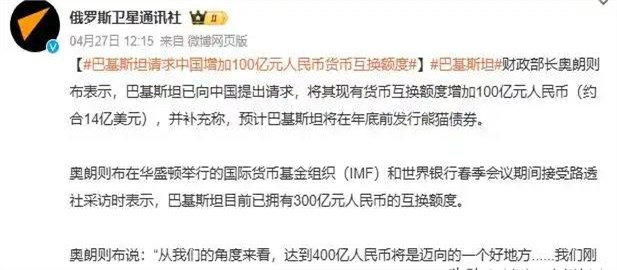 4月26日,巴基斯坦财政部长对外透露,巴基斯坦已经向中国发出了扩大货币互换额度的请求,把两国之间目前300亿人民币的互换额度再加上100亿,达到400亿人民币的规模。