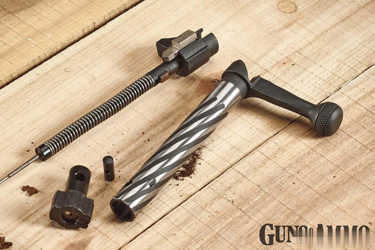 使用.350 传奇弹药时,“爱国者”步枪配备一根22英寸(558.8mm)的凹槽枪管。枪管采用浮置式设计,不过间隙很小。这种两件式枪栓套可不常见。它能安装一个可拆卸的双凸耳枪栓头,由一个定位销固定,定位销上有一个供撞针穿过的孔。拆解起来也很简单。