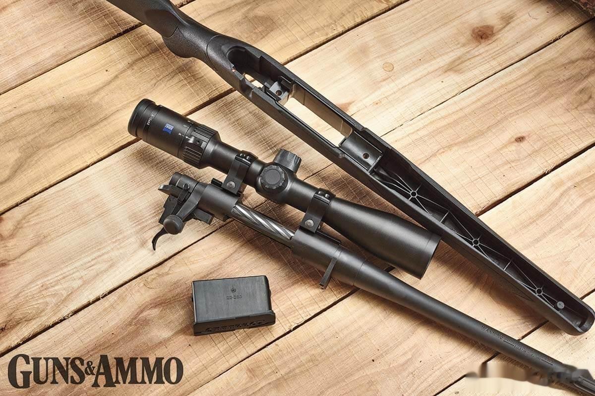 把带膛枪管组件和弹匣从枪托上拆下来,就能看到这款栓动步枪简单的设计。莫斯伯格在枪身后部设置了一个可调节扳机,还在枪管和枪机之间安装了一个后坐力凸耳,用来将后坐能量传递到枪托上。