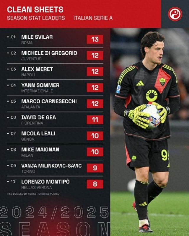 直播吧4月23日讯 Squawka统计了意甲门将本赛季的联赛零封次数,并列出榜单,斯维拉尔13次居首。