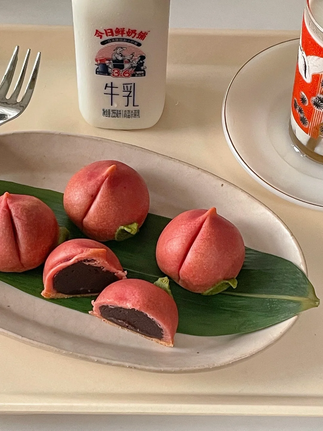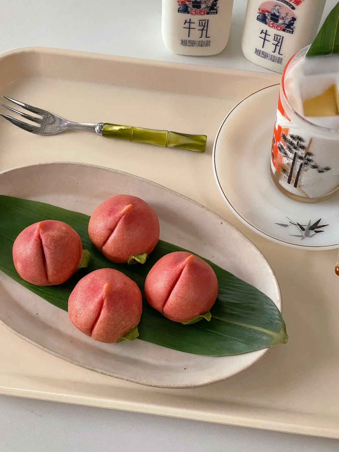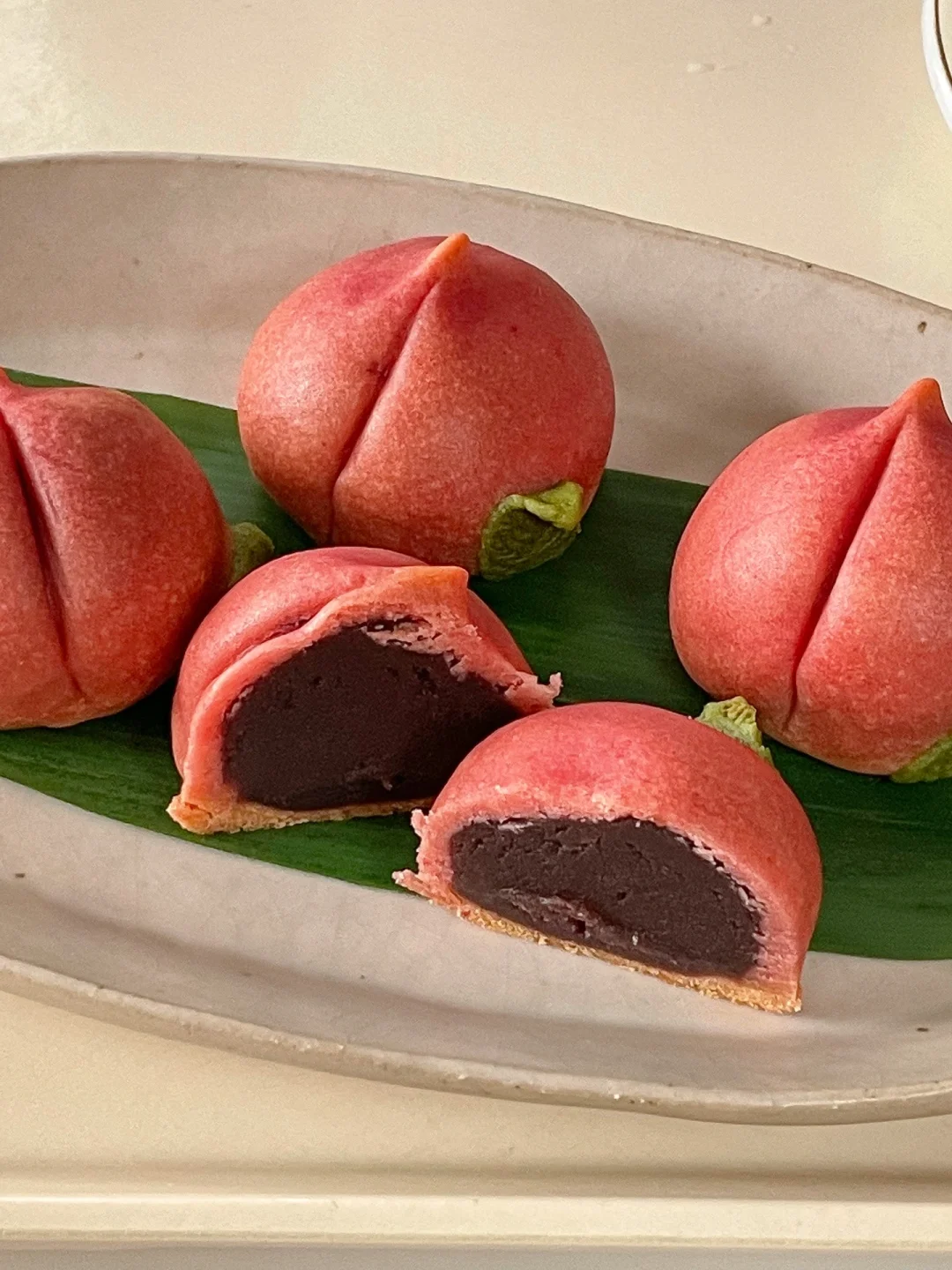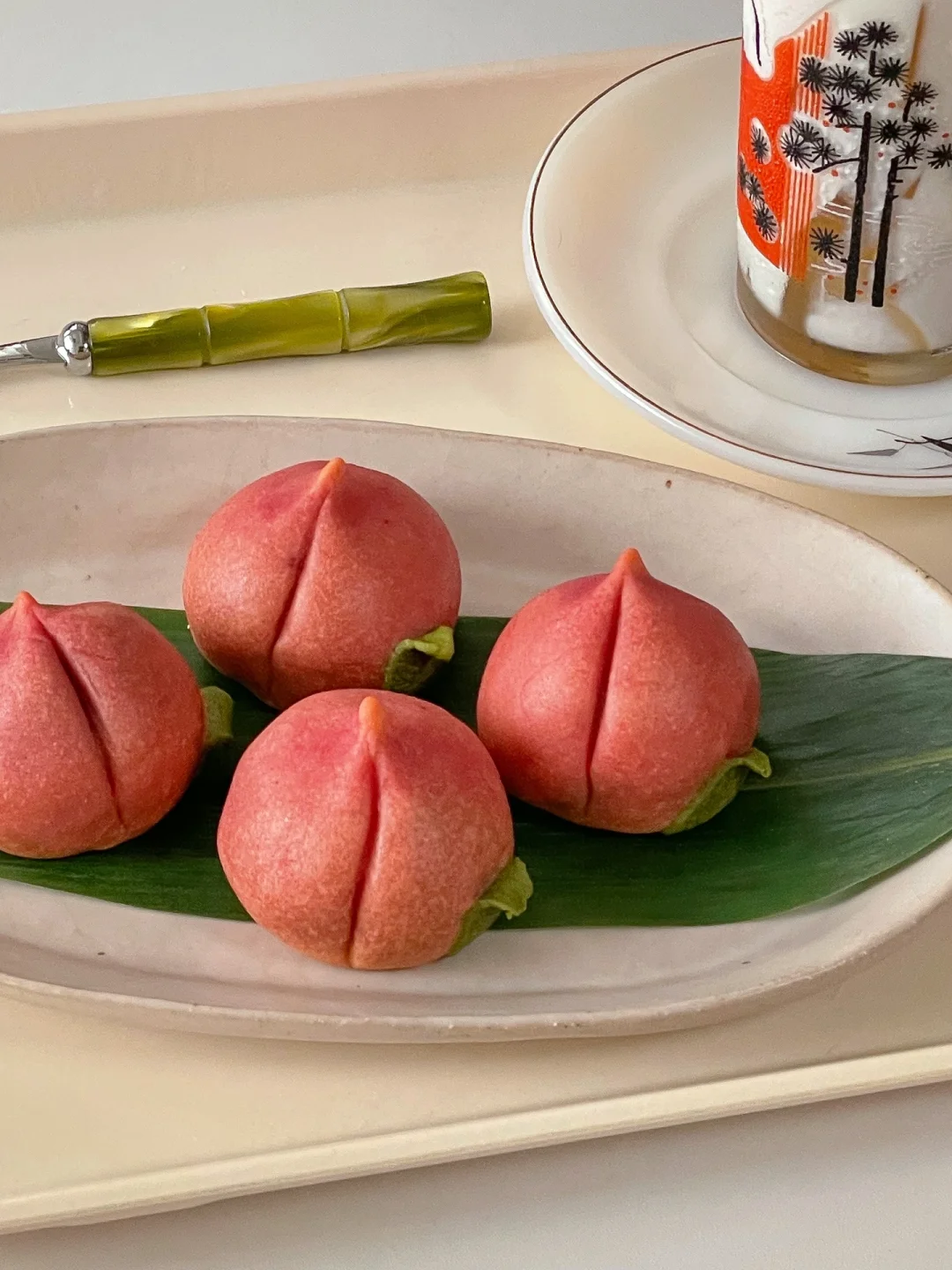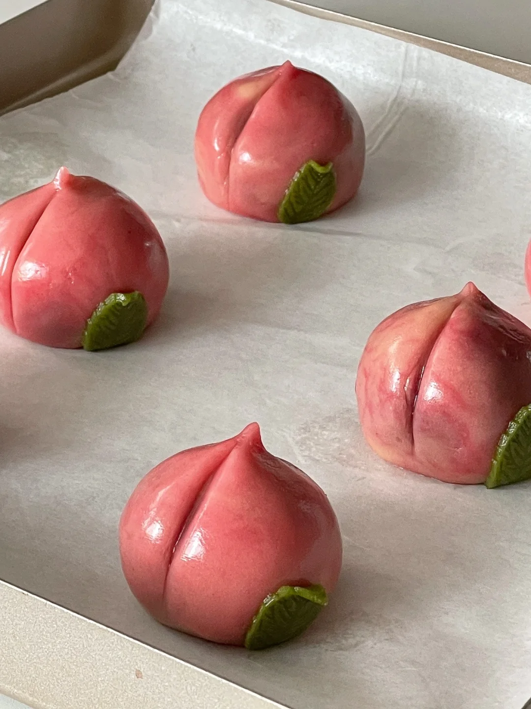 7️⃣绿色面团擀开后用模具按压出叶子,贴在桃子上