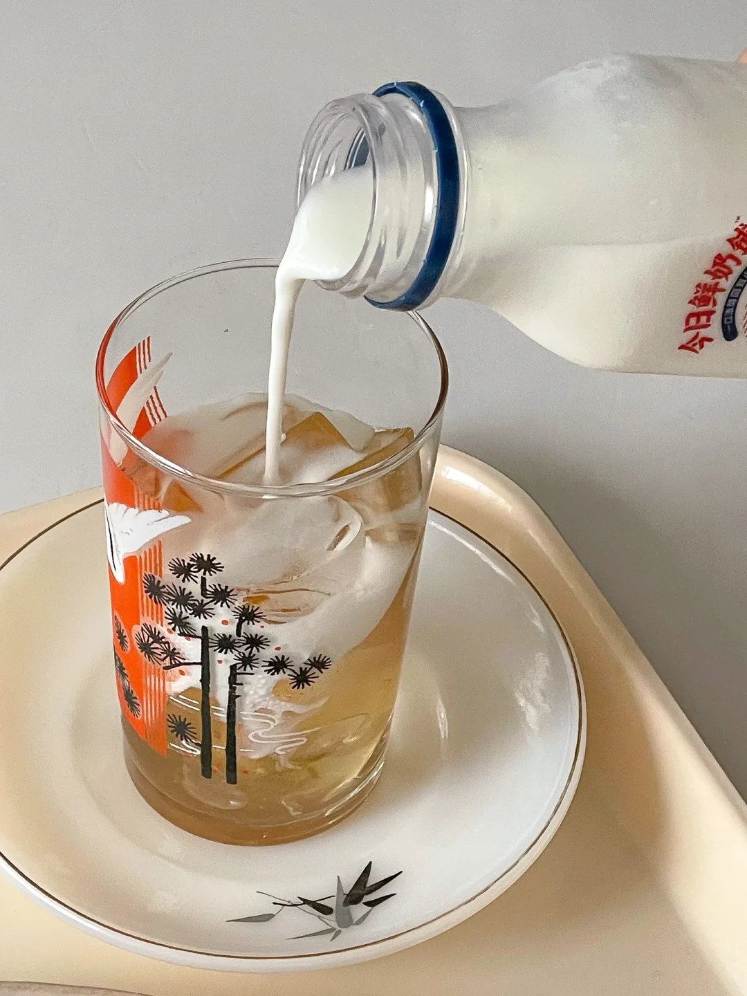 2️⃣茶冻切块放入杯中加入冰块,倒入牛奶即可