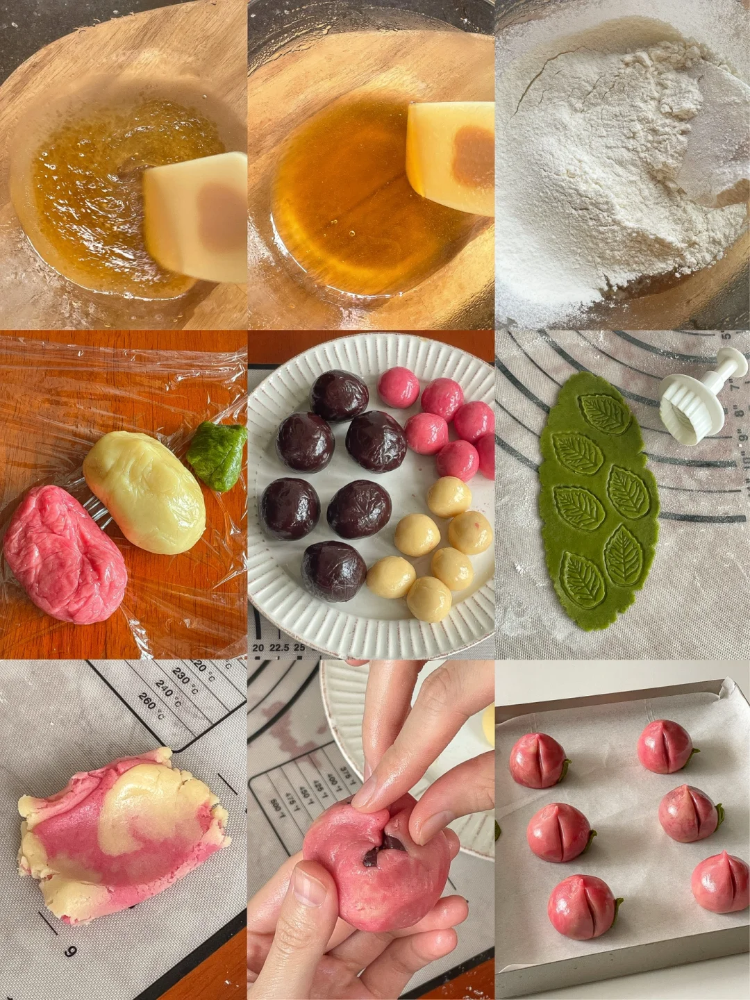 5️⃣两种面团混合在一起,揉出混色面团,按压扁包入馅料,用虎口收紧,捏出桃子的形状